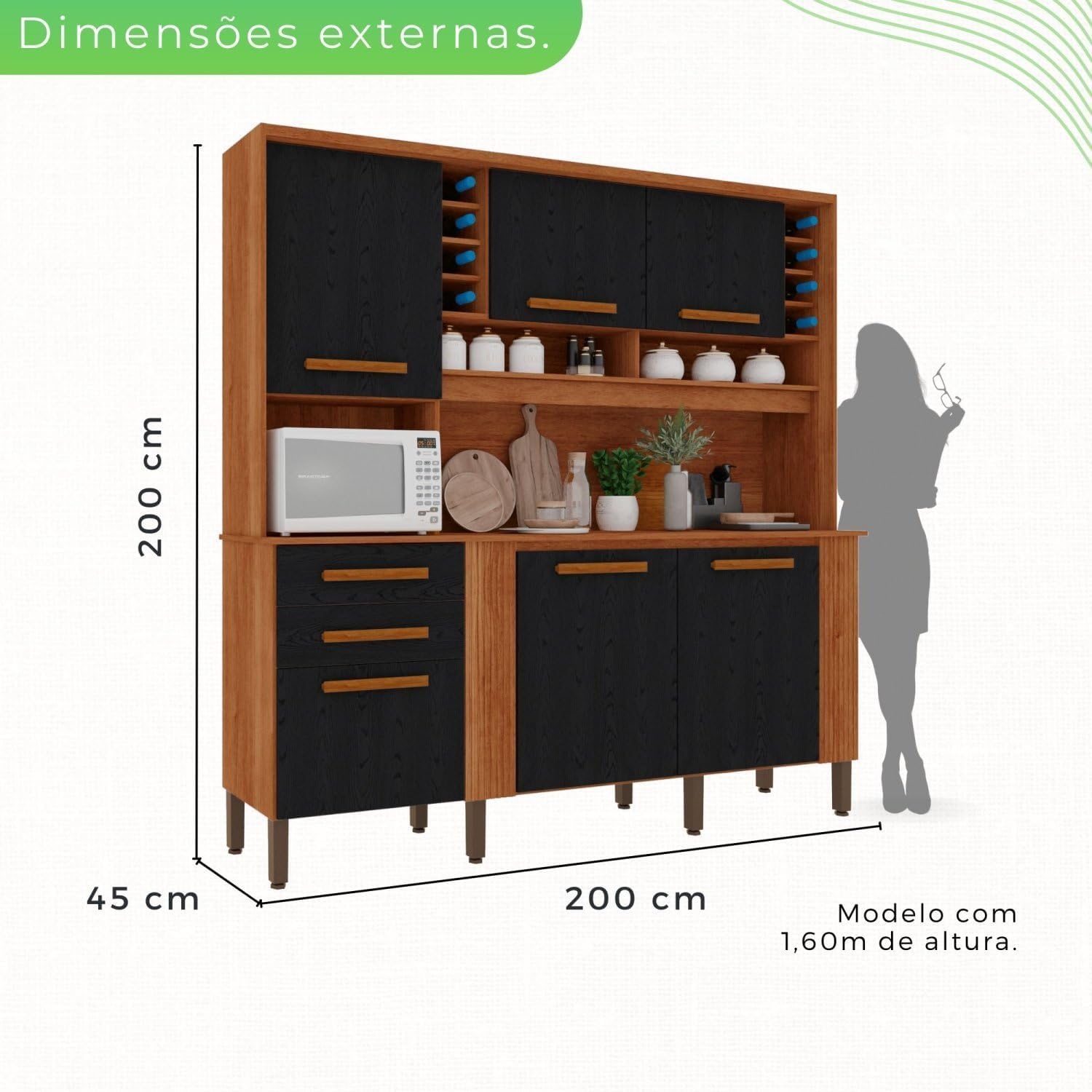 Fabricado em madeira de engenharia robusta, o armário possui dimensões totais de 45 x 200 x 200 cm e um peso de 99,3 kg. A estrutura sólida assegura durabilidade contra o uso contínuo, enquanto as medidas foram pensadas para otimizar o aproveitamento da área disponível em sua cozinha.