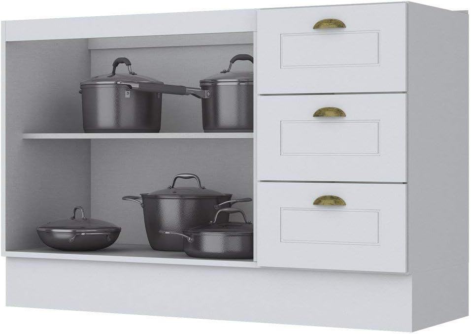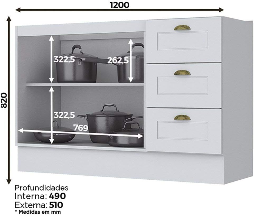Pensado para a organização total, o balcão conta com três gavetas, sendo uma delas equipada com um prático divisor de talheres, além de duas prateleiras amplas no compartimento das portas. As dobradiças de 35mm possuem sistema de amortecimento, o que evita impactos bruscos e garante um fechamento suave e silencioso.