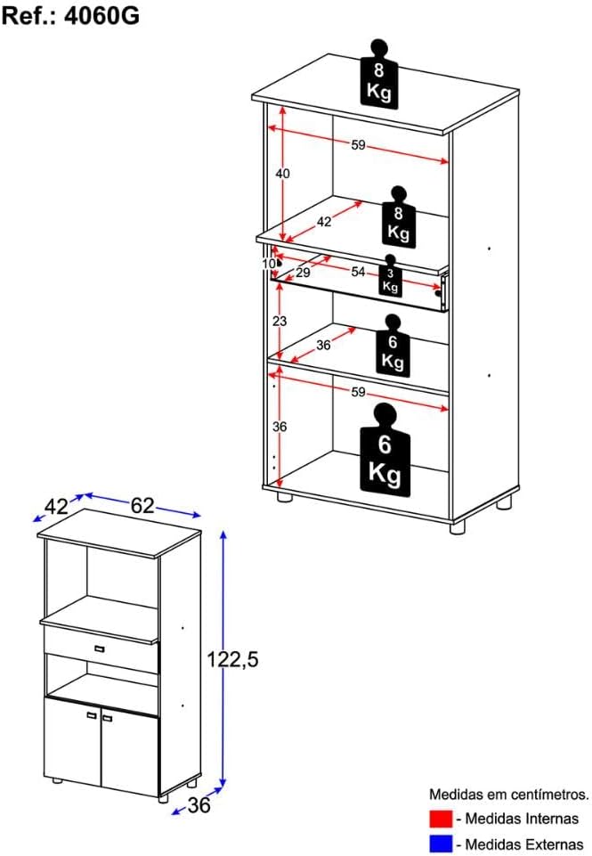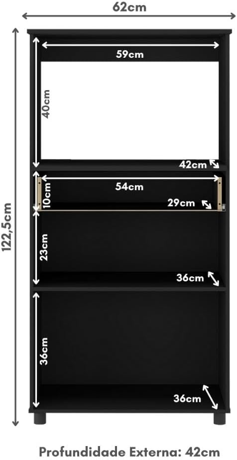 O produto montado apresenta as medidas totais de 122,5 cm de altura, 62 cm de largura e 42,3 cm de profundidade, proporcionando um encaixe preciso em diferentes layouts de cozinha. Com um peso total de 21,5 kg, o móvel é robusto e estável, seguindo um padrão de construção sólida em MDP que assegura a segurança dos aparelhos posicionados sobre ele.