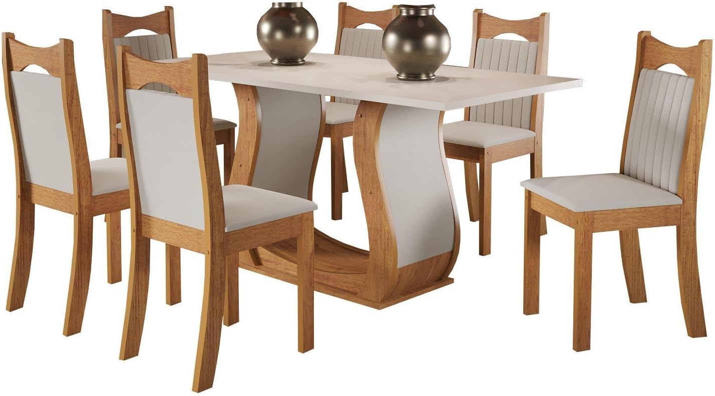 O Conjunto de Jantar Mesa Retangular Buenos Aires com 6 Cadeiras Dalas foi desenvolvido para transformar o ambiente mais acolhedor da sua casa. Unindo funcionalidade e um design sofisticado nas cores Mel, Blonde e Marfim, este conjunto adapta-se perfeitamente tanto à sala de jantar quanto à cozinha, proporcionando beleza e conforto para as refeições diárias e momentos especiais com convidados.