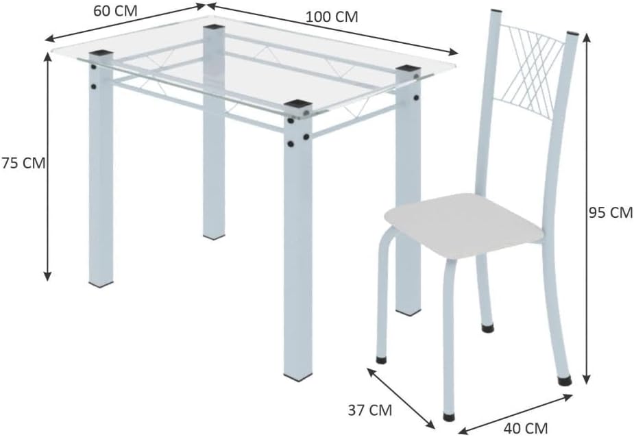O conjunto apresenta um fator de forma retangular com profundidade de 60 centímetros, ideal para acomodar quatro pessoas confortavelmente. O material principal é o vidro, presente no topo da mesa, complementado por uma estrutura resistente que garante a longevidade do produto. As dimensões da embalagem são de aproximadamente 101 x 100 x 23,91 cm, com um peso total de 72,44 quilogramas.