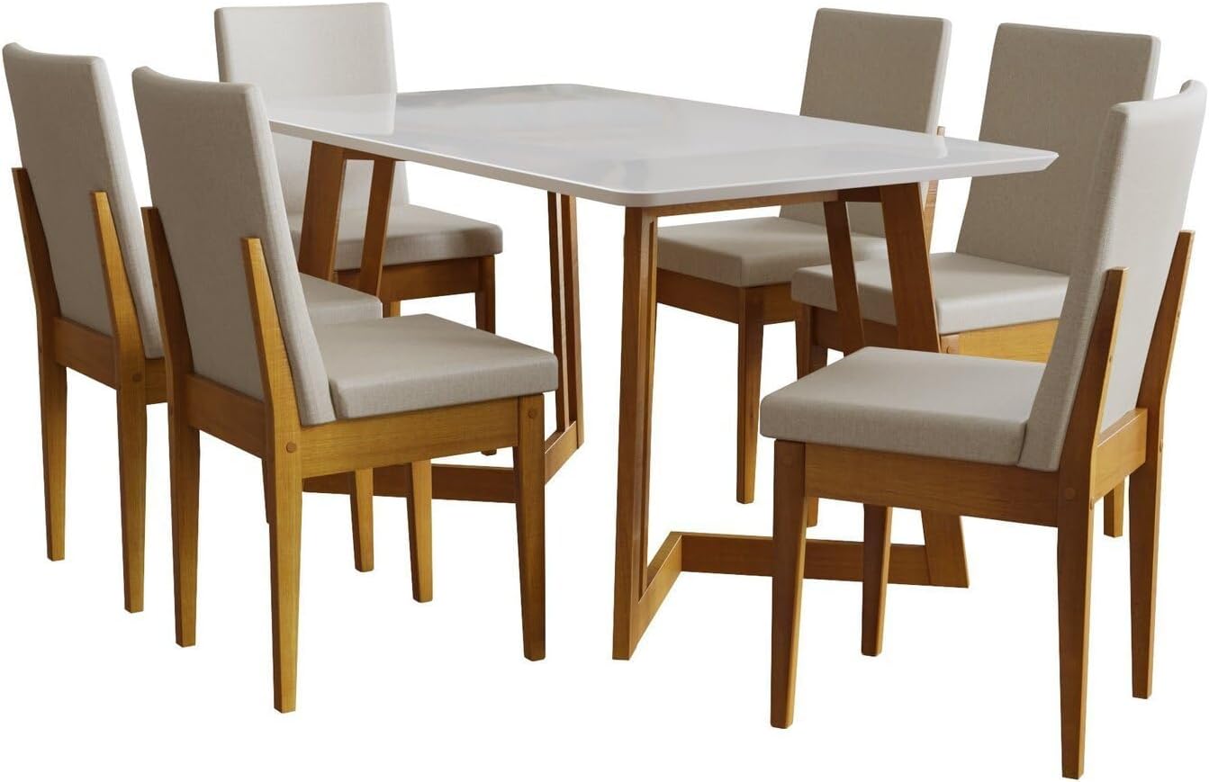 A fabricação utiliza Madeira Maciça Cerejeira e Eucalipto, materiais nobres que conferem um peso total de aproximadamente 50 quilogramas ao conjunto. O produto acompanha 1 mesa, 6 cadeiras completas, kit de ferragem e um manual detalhado para auxiliar na montagem.