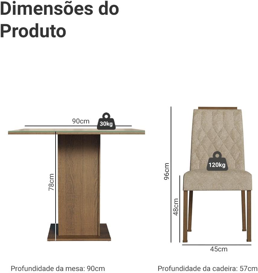 Fabricado em MDP de alta resistência, o conjunto possui mesa com altura de 78 cm e tampo quadrado de 90 cm x 90 cm. As cadeiras apresentam dimensões de 96 cm de altura, 45 cm de largura e 57 cm de profundidade, suportando o uso diário com durabilidade. O peso total do conjunto é de aproximadamente 50,26 kg.