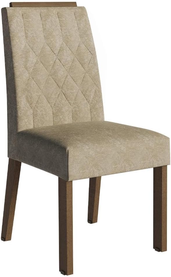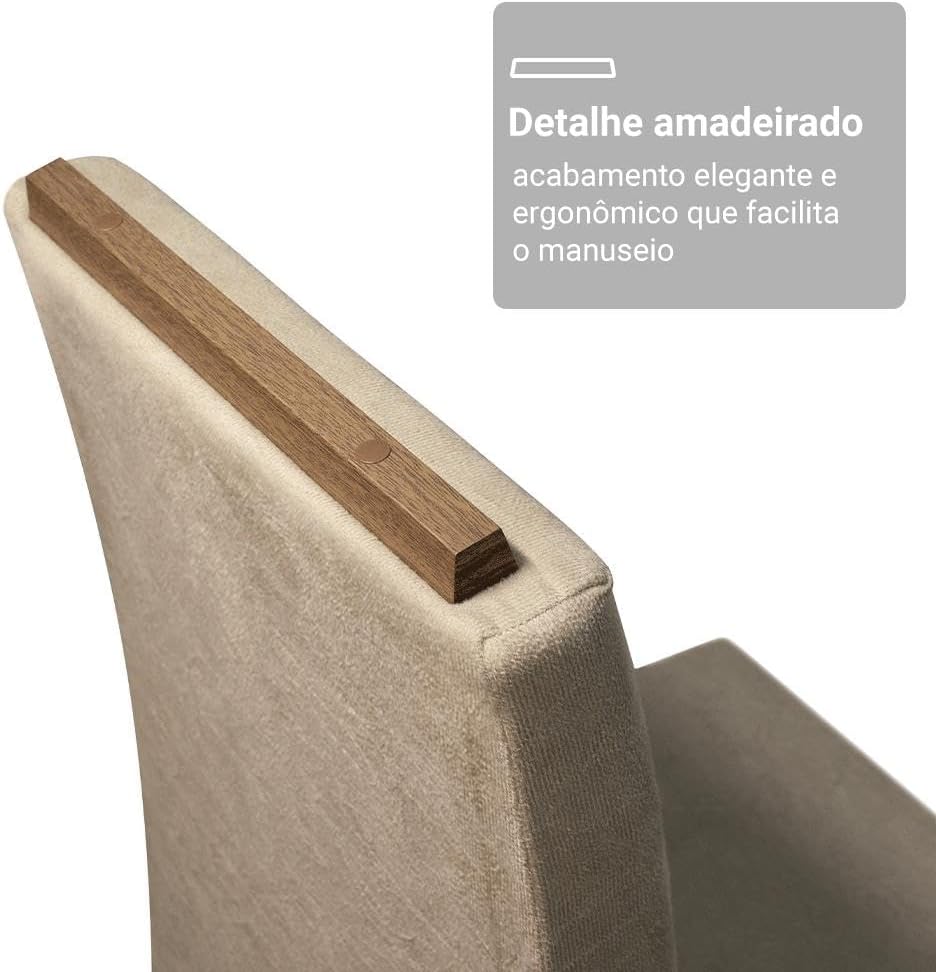 As quatro cadeiras estofadas no tecido Suede Imperial possuem um toque macio e contam com um detalhe amadeirado no topo do encosto, facilitando o manuseio e agregando um charme extra. O acabamento em tons Rustic e Crema é versátil, combinando facilmente com diferentes estilos de cozinhas e salas de jantar.