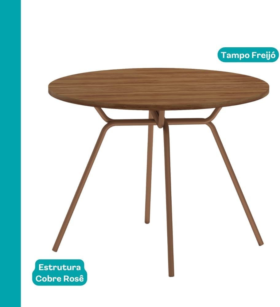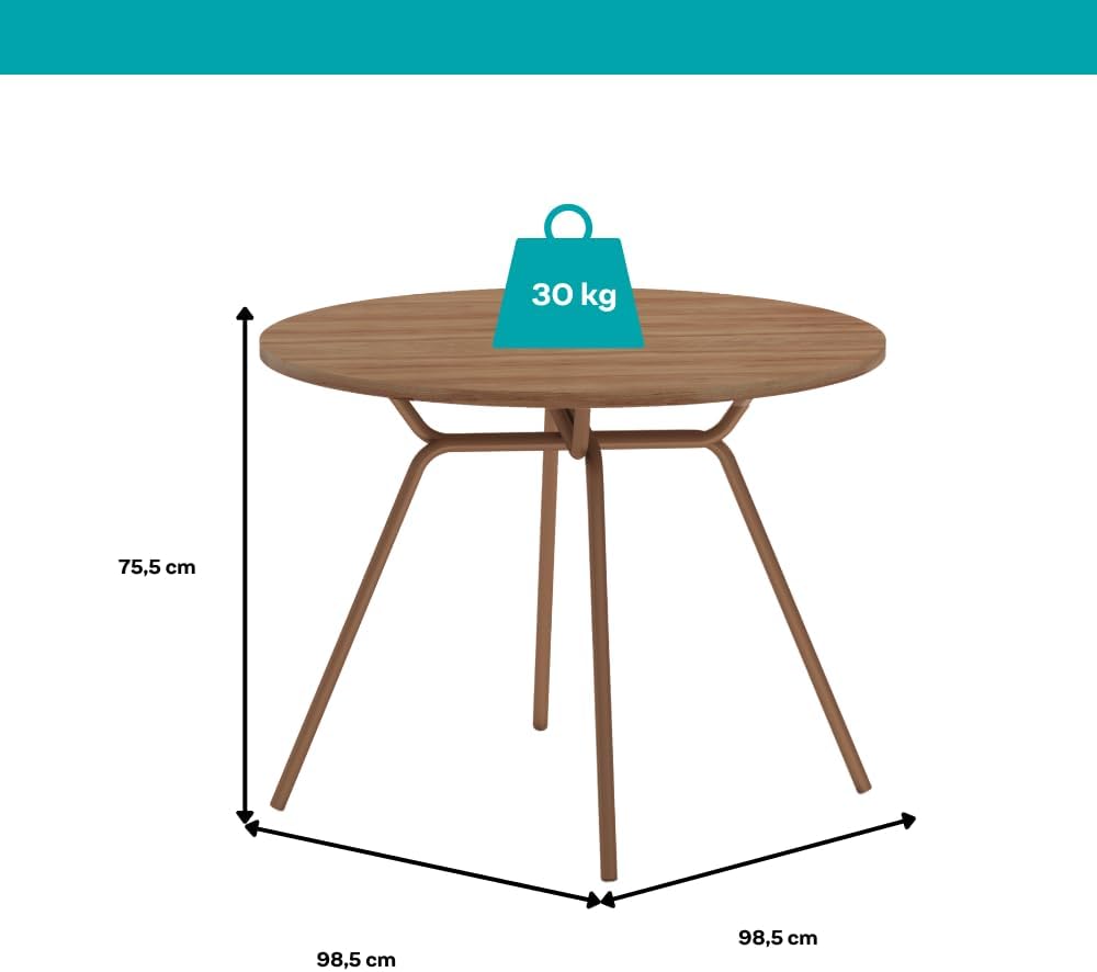 A mesa possui dimensões aproximadas de 98,5 x 98,5 x 90 centímetros, apresentando uma profundidade de item de 100 centímetros. Com um peso total de 44,26 quilogramas, o móvel oferece estabilidade sólida, sendo fabricado com materiais de alta qualidade como MDF e aço para suportar a rotina doméstica com segurança.