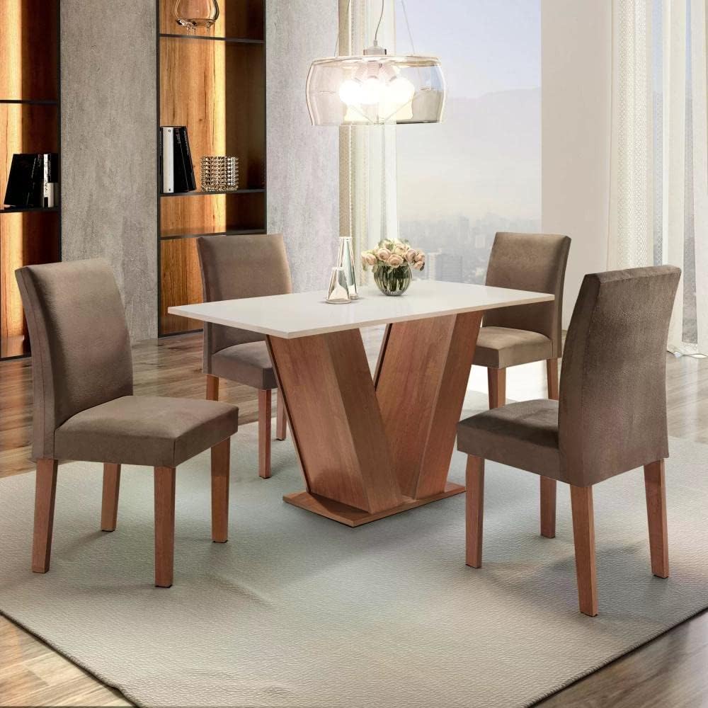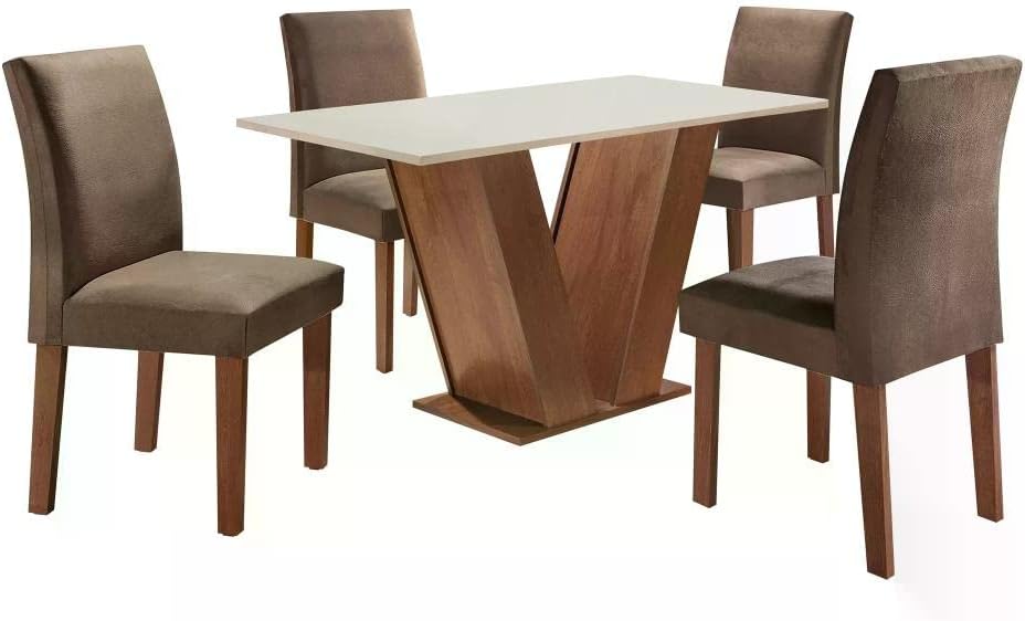Este conjunto de mesa e 4 cadeiras é perfeito para famílias que desejam um ambiente de jantar elegante e funcional em apartamentos ou casas que valorizam um estilo decorativo contemporâneo e o conforto do revestimento em suede.