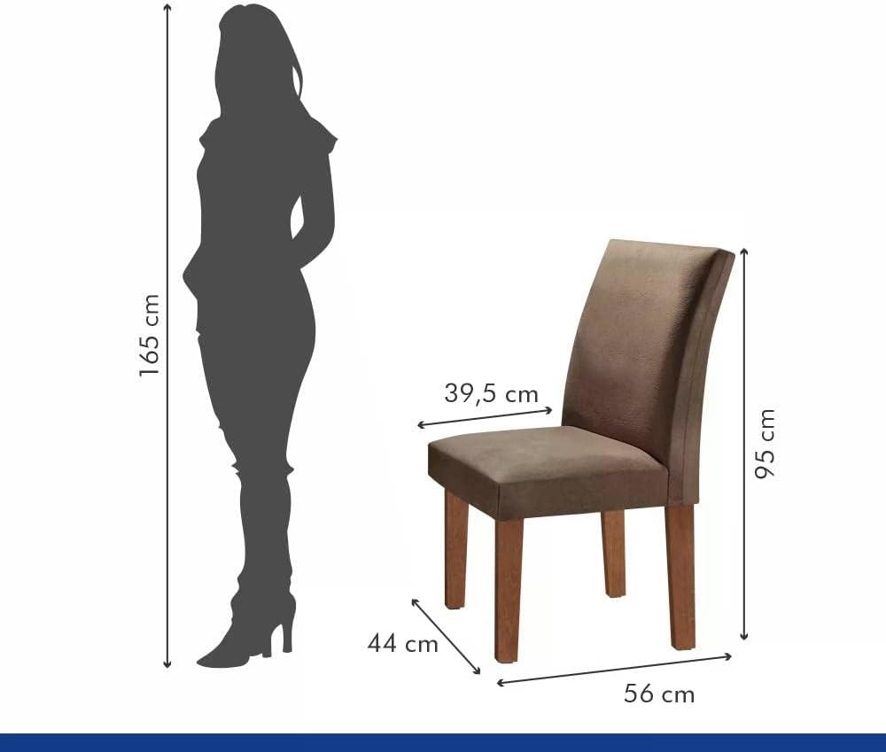 Cada uma das 6 cadeiras suporta até 120 kg e possui medidas de 95cm de altura, 44cm de largura e 56cm de profundidade. O conjunto total apresenta um peso aproximado de 135,44 kg, assegurando estabilidade e durabilidade para o uso contínuo em salas de jantar amplas.