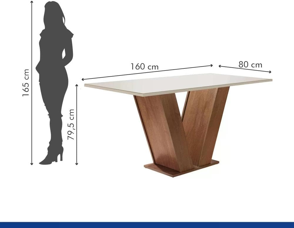 A estrutura completa é fabricada em MDF de alta qualidade com acabamento em pintura UV fosca. A mesa possui dimensões de 79,5cm de altura, 160cm de largura e 80cm de profundidade, suportando até 40 kg sobre o tampo de 22mm de espessura.