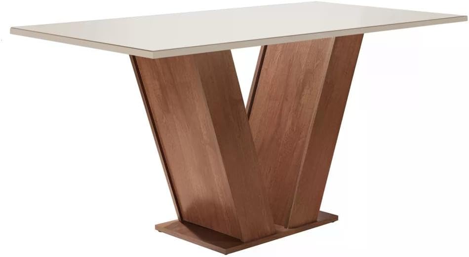 Este conjunto destaca-se pela sua mesa com base em V, que oferece um visual contemporâneo e facilita a acomodação das pernas, proporcionando maior liberdade de movimento. O tampo retangular em MDF conta com um acabamento superior em vidro temperado de 4mm, garantindo resistência e um brilho sofisticado ao móvel.