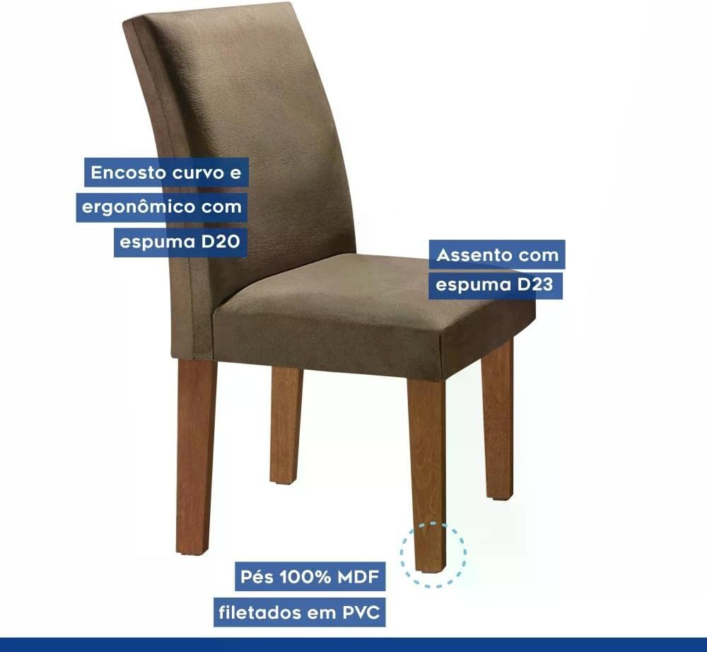 As cadeiras são projetadas para o máximo bem-estar, apresentando encosto e assento totalmente estofados com espumas de densidade D-20 e D-23. O revestimento em tecido suede oferece um toque macio e elegante, elevando a experiência de conforto para você e seus convidados no dia a dia.