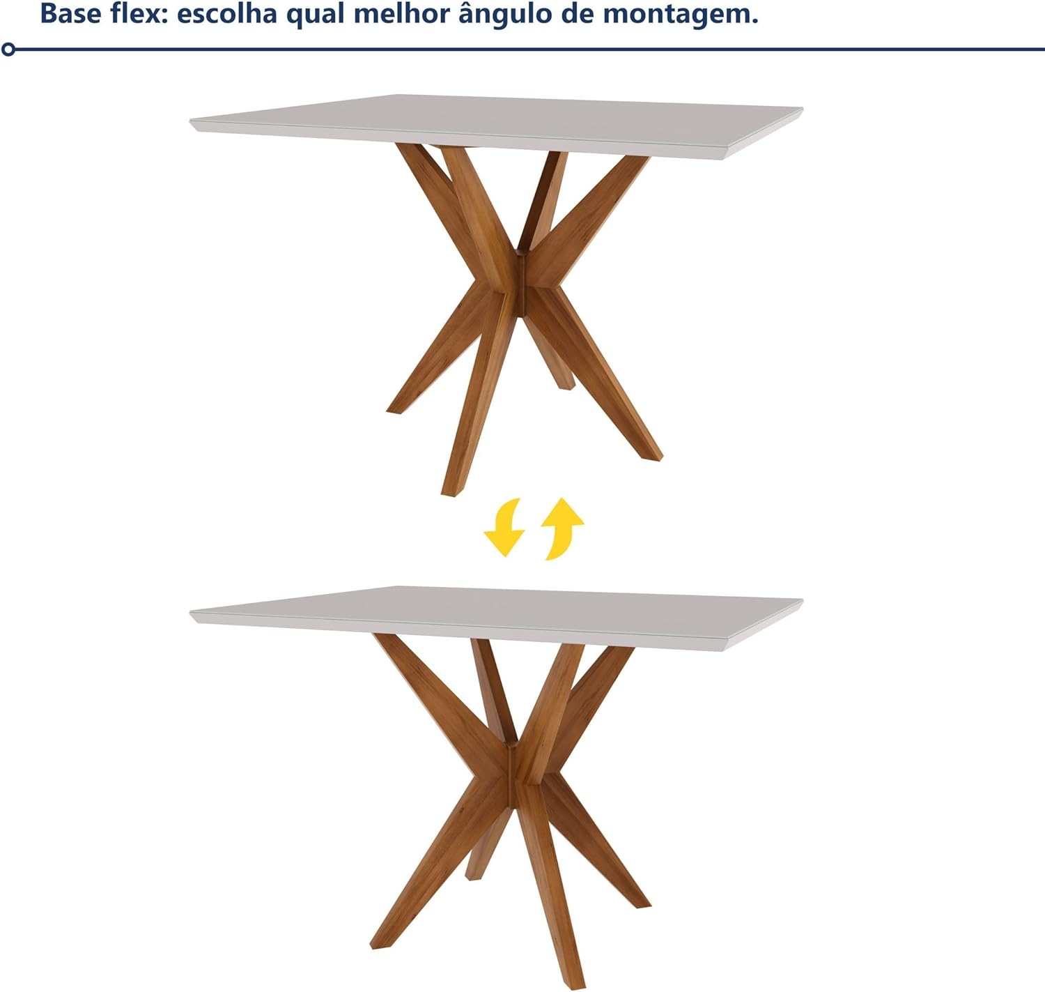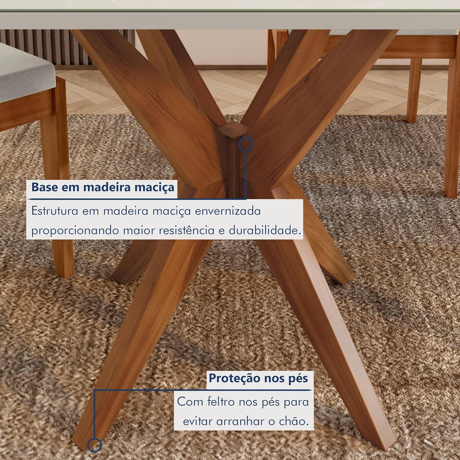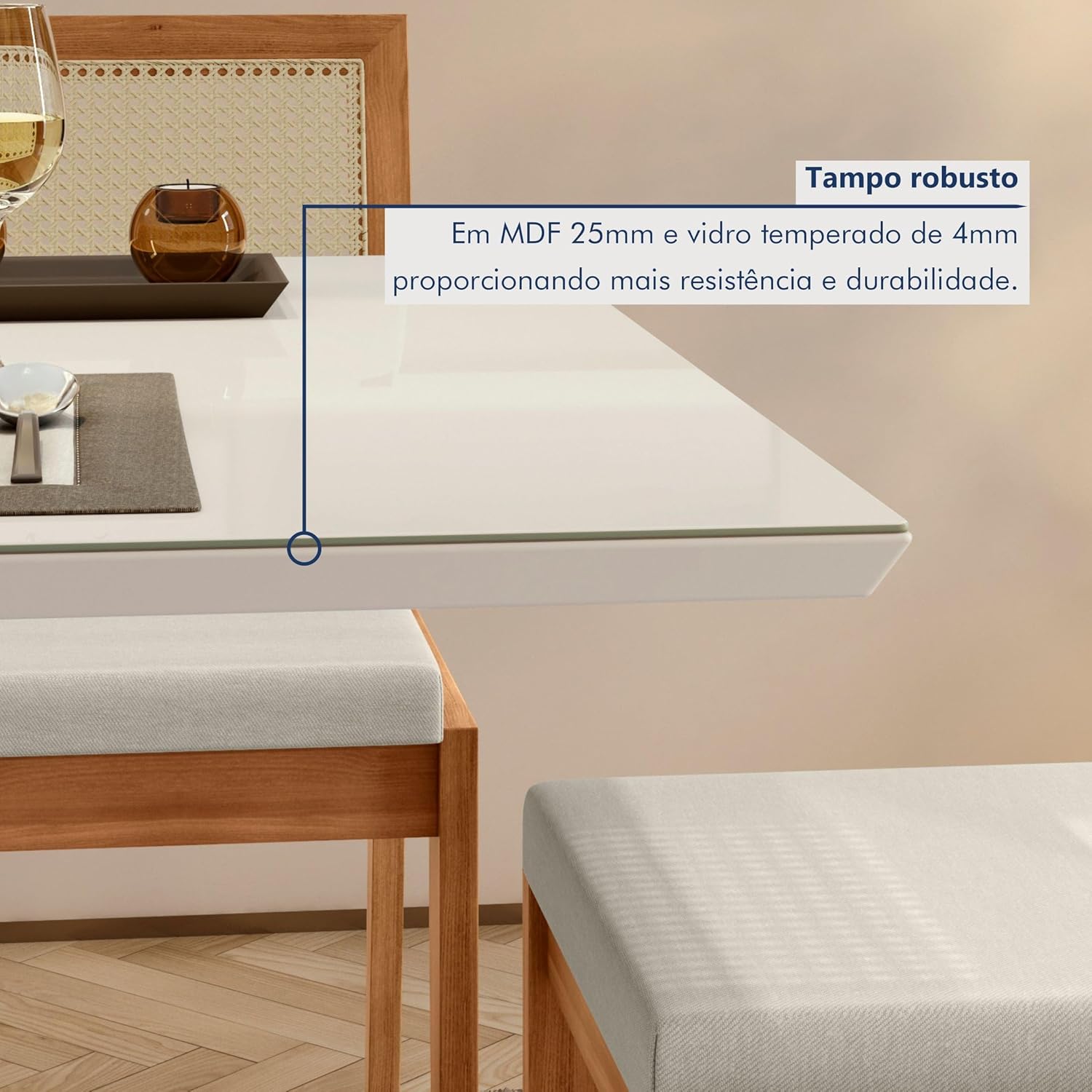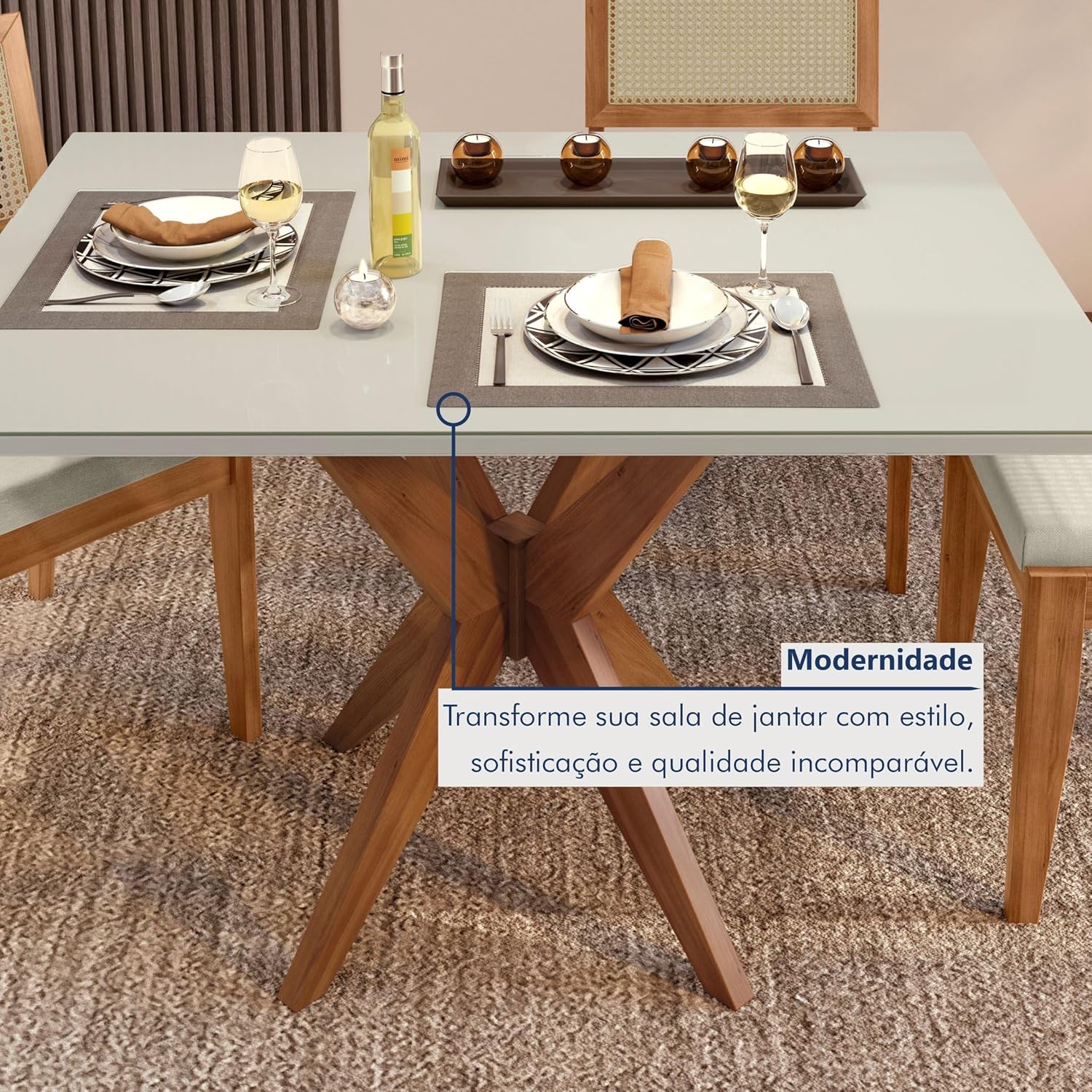 Este conjunto é fabricado 100% em madeira maciça de eucalipto selecionado, garantindo uma estrutura robusta e vida útil prolongada para o seu móvel. A sofisticação fica por conta do tampo em MDF com vidro temperado serigrafado, que facilita a limpeza e oferece um brilho moderno à sala de jantar.