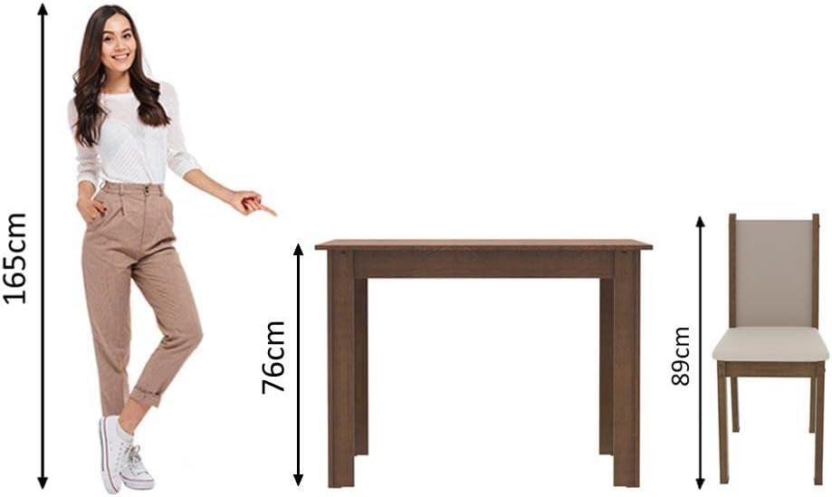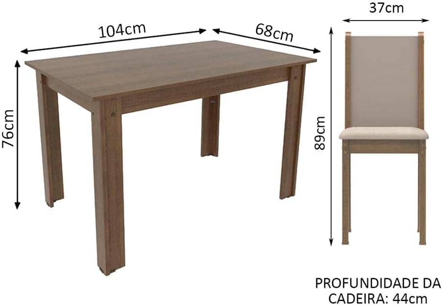 O Conjunto de Jantar Cíntia Madesa possui uma mesa com dimensões de 104 cm de comprimento, 68 cm de largura e 76 cm de altura. O tampo é robusto e fabricado em madeira, garantindo estabilidade e um visual elegante para sua sala ou cozinha.