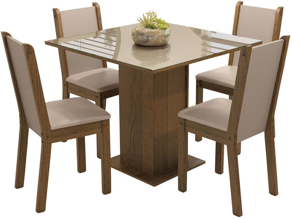 Este conjunto de sala de jantar destaca-se pela sua mesa quadrada, que otimiza o espaço e permite uma circulação fluida no ambiente. A estrutura robusta garante estabilidade, proporcionando segurança durante o uso diário, enquanto o design elegante se adapta facilmente a diferentes estilos de decoração residencial.