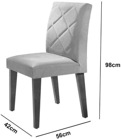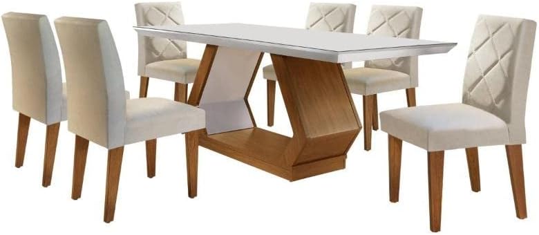 Este conjunto se destaca pelo design arrojado e imponente, apresentando uma mesa com tampo amplo e detalhes chanfrados que renovam a estética do ambiente. A sofisticação é elevada pelo detalhe bordado no encosto das cadeiras, conferindo um toque artesanal e exclusivo à sua decoração diária.