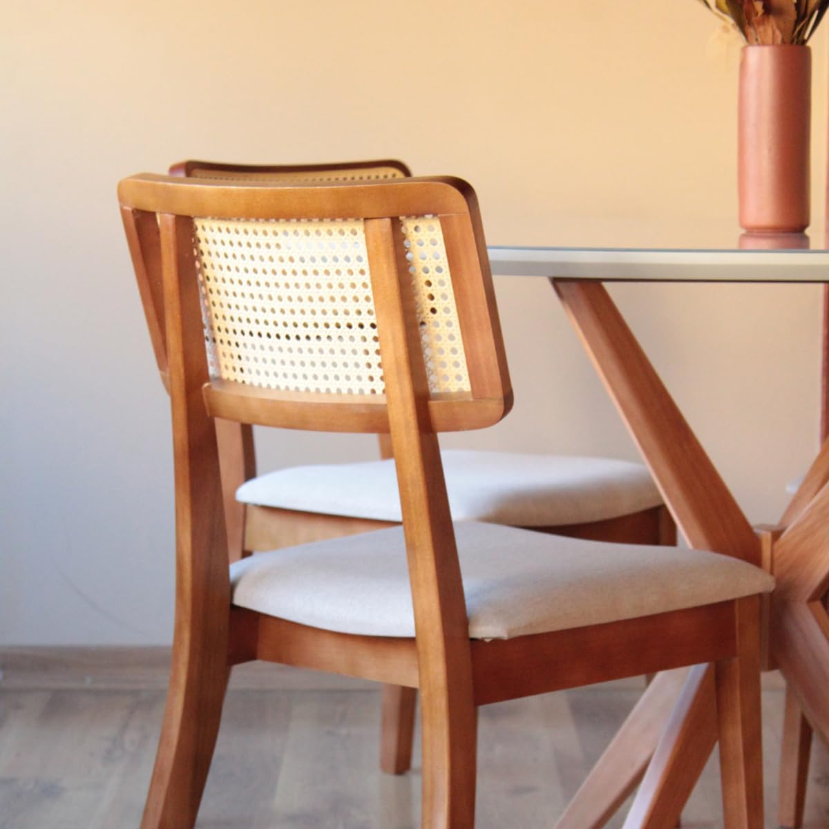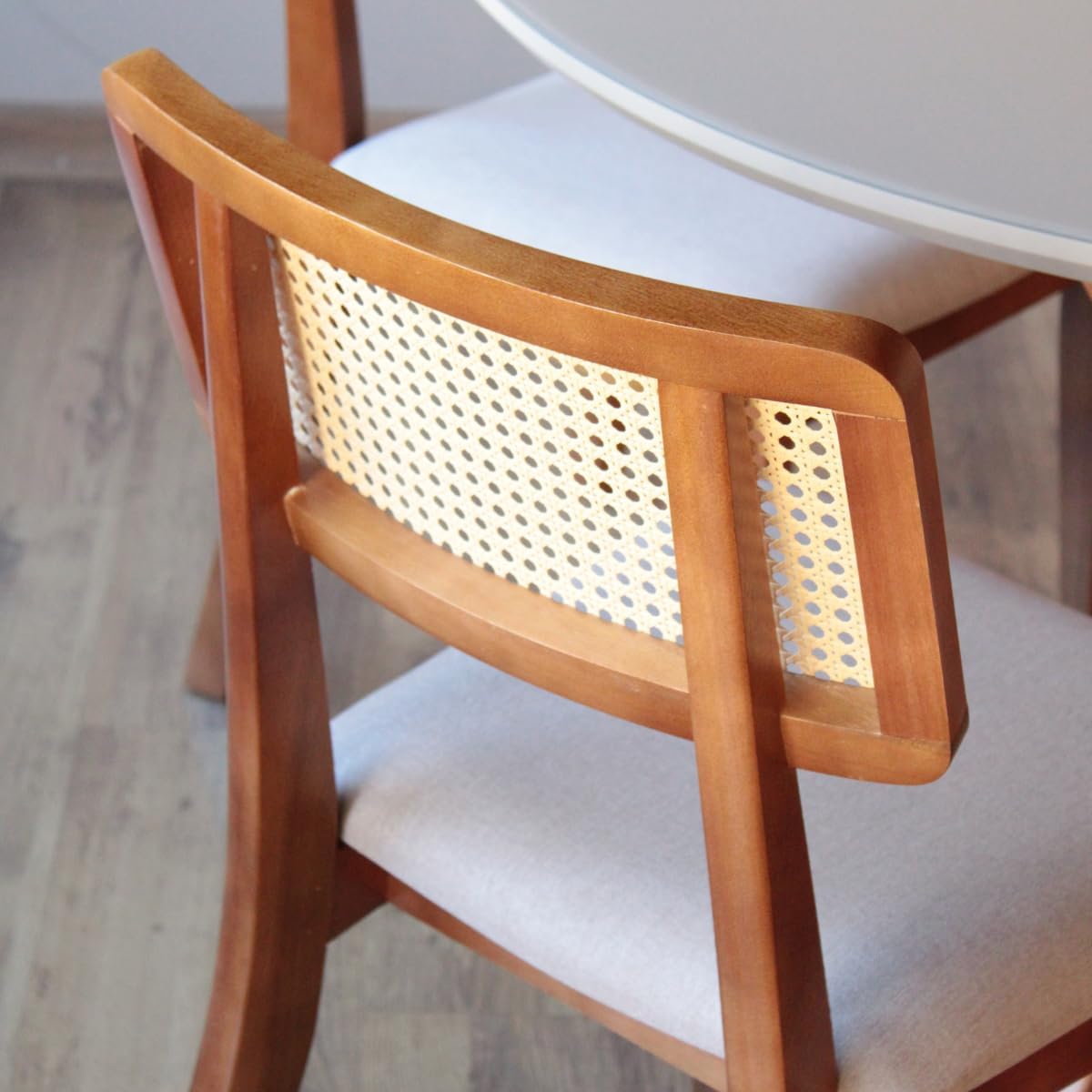 As 4 Cadeiras Lilia são verdadeiras peças de design, fabricadas em madeira maciça de lei para máxima durabilidade. O encosto em rattan sextavado natural aliado ao assento estofado em linho de alta qualidade oferece um toque clássico e ergonômico, garantindo conforto prolongado durante jantares especiais.