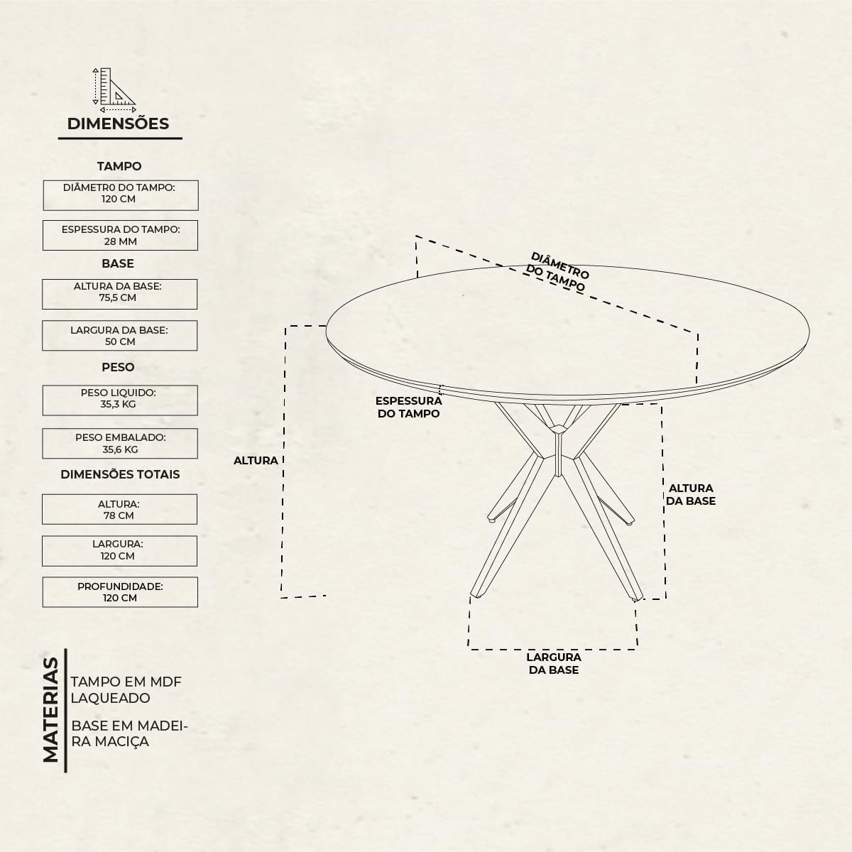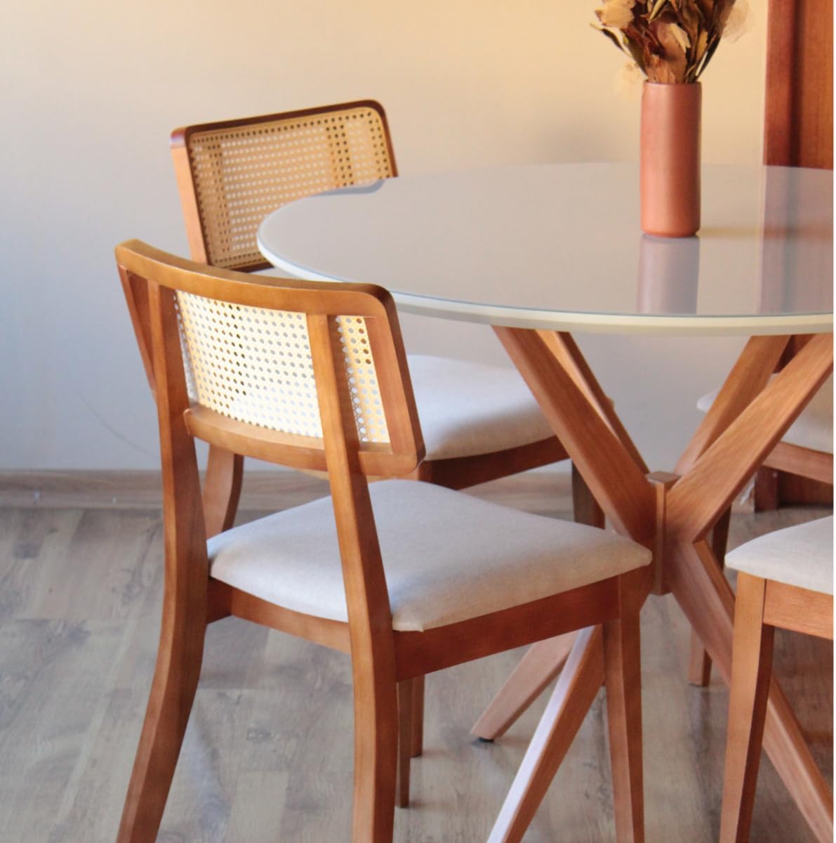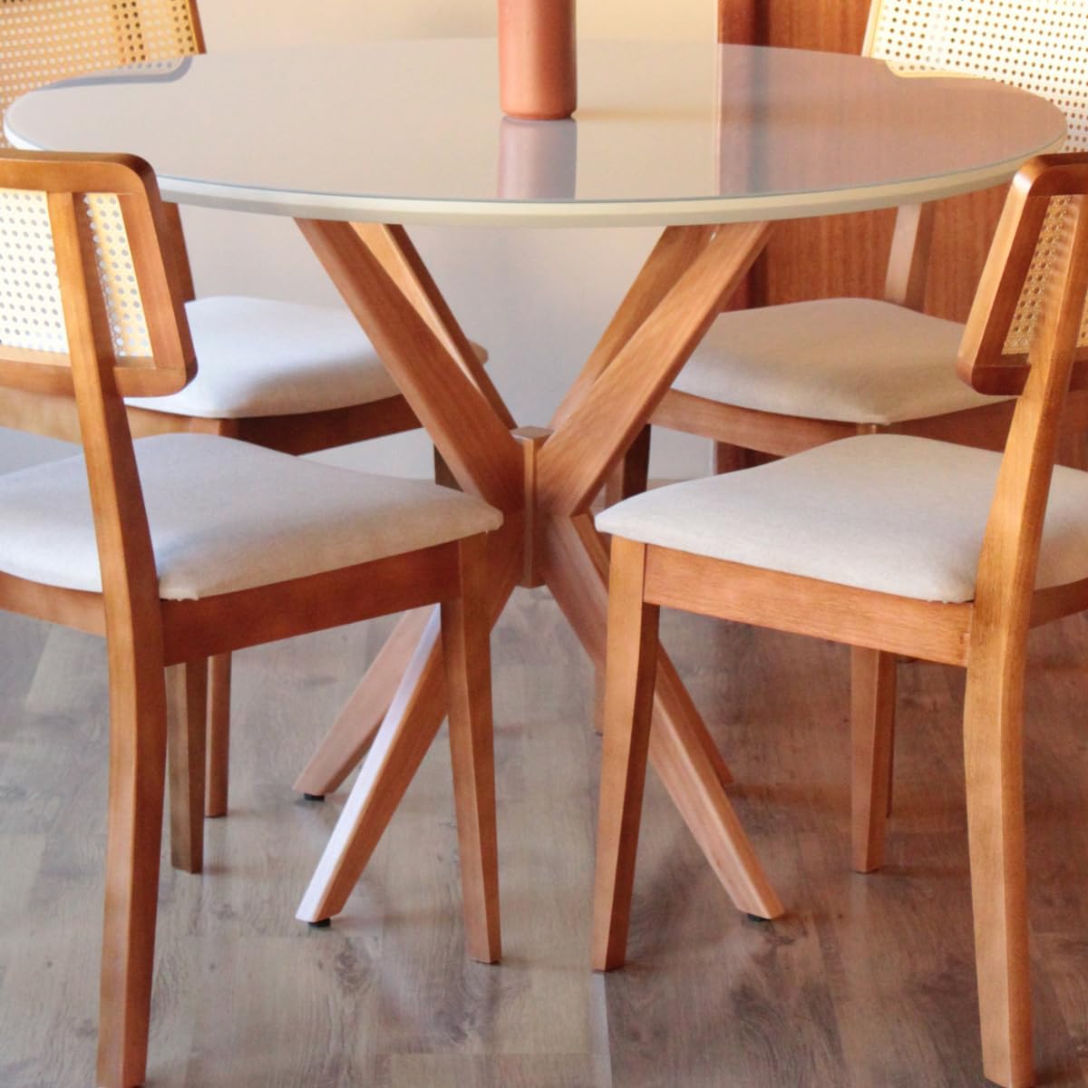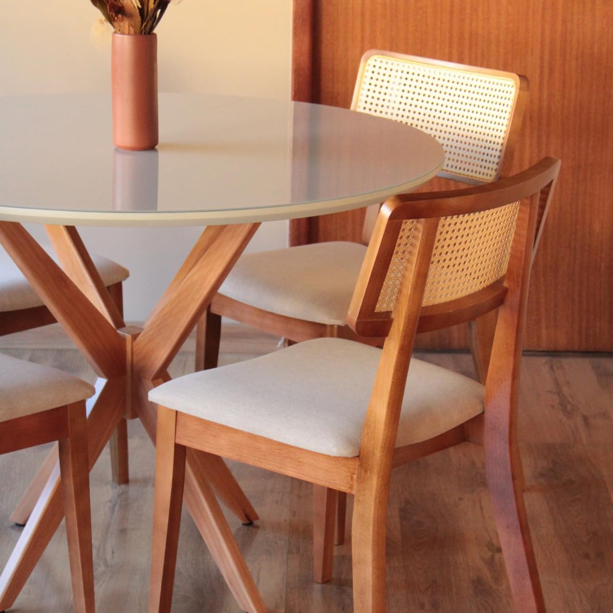 A mesa possui diâmetro de 120 cm e altura de 78 cm, com tampo total de 21 mm de espessura (composto por madeira e vidro). As 4 cadeiras apresentam altura de 85 cm, largura de 47 cm e profundidade de 52 cm, suportando o uso contínuo graças à estrutura sólida em madeira maciça.