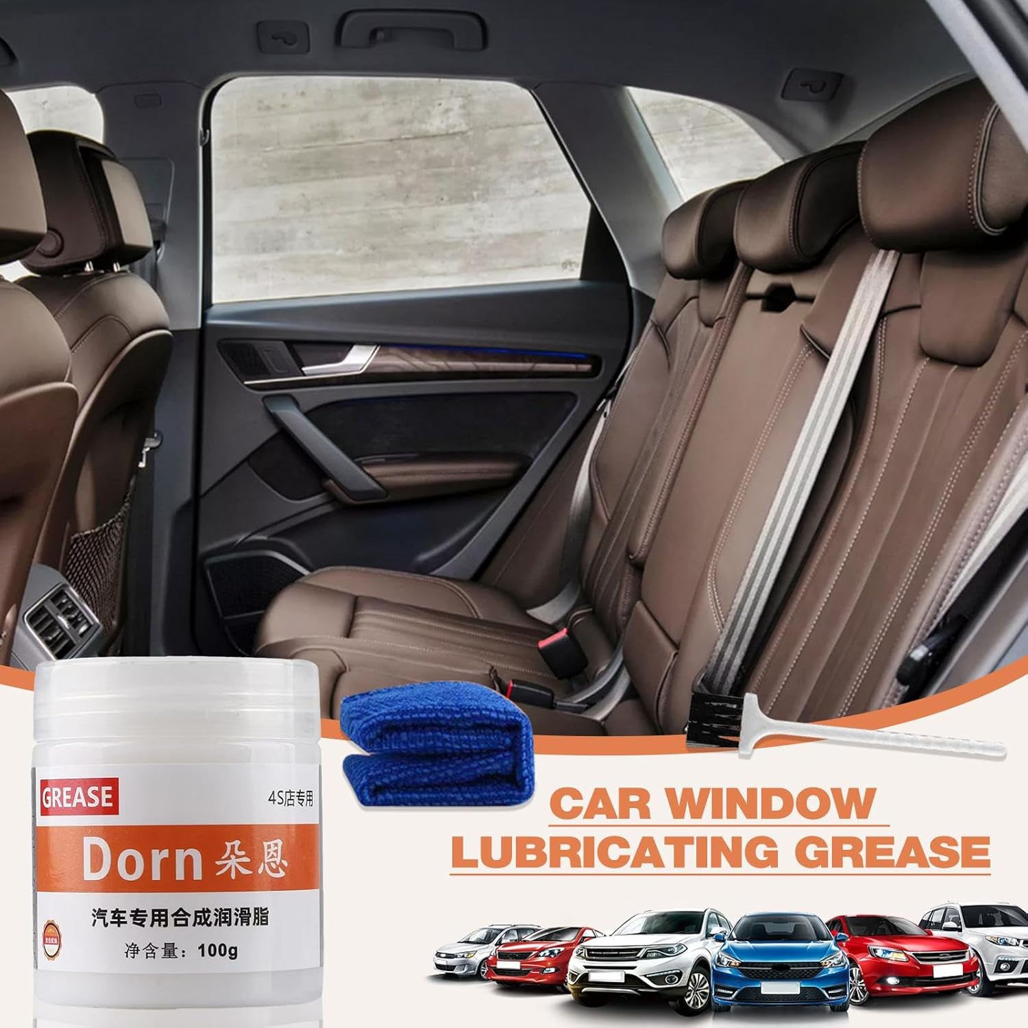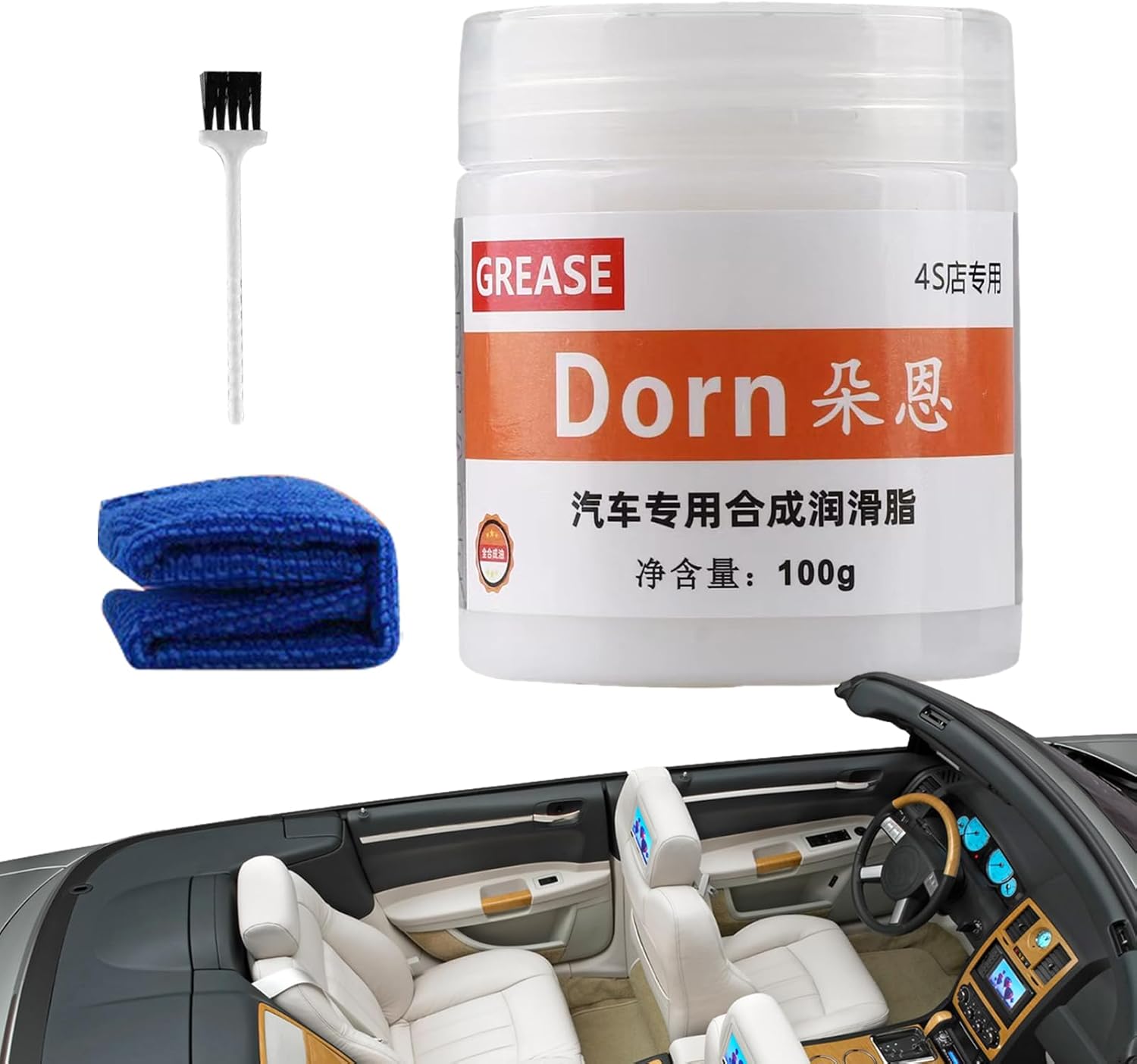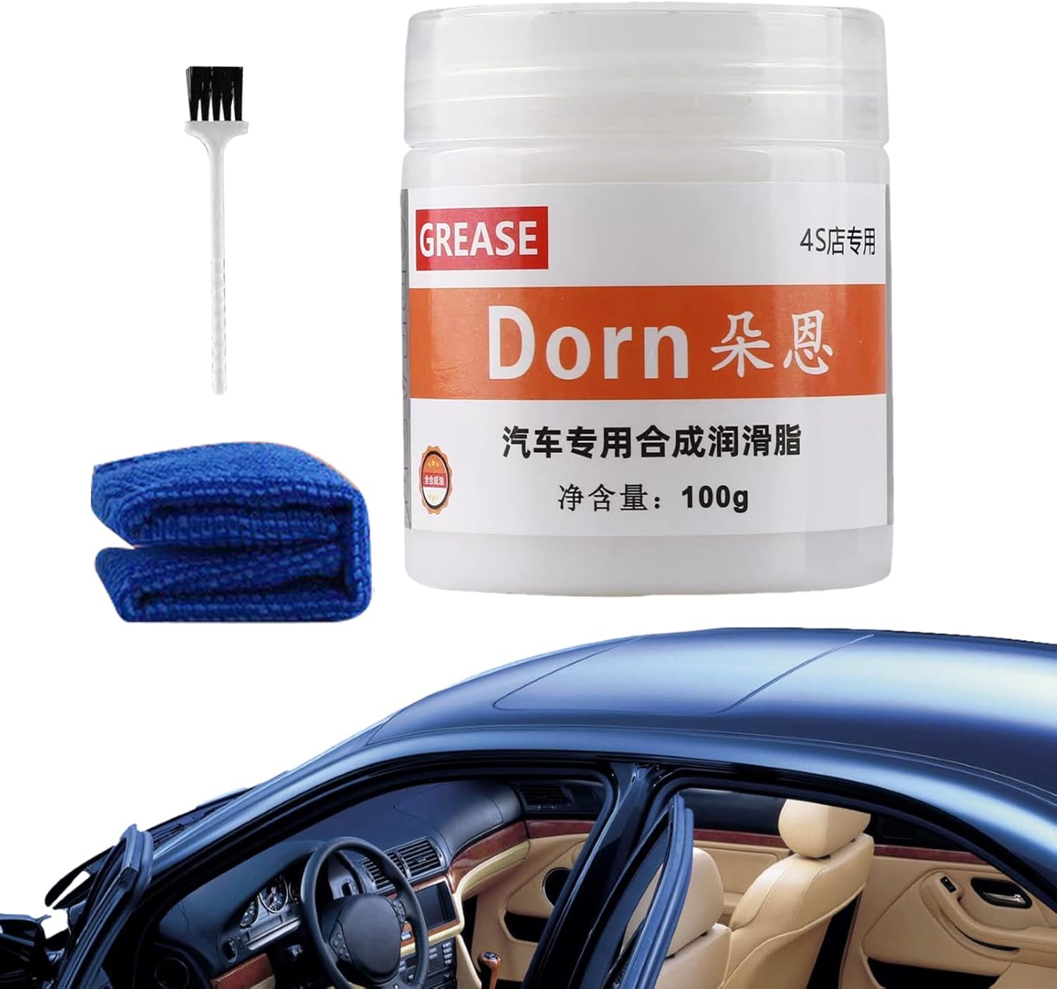 Acompanha uma embalagem de lubrificante de graxa para porta de carro, além de uma toalha e uma escova para facilitar a aplicação e limpeza prévia das superfícies.