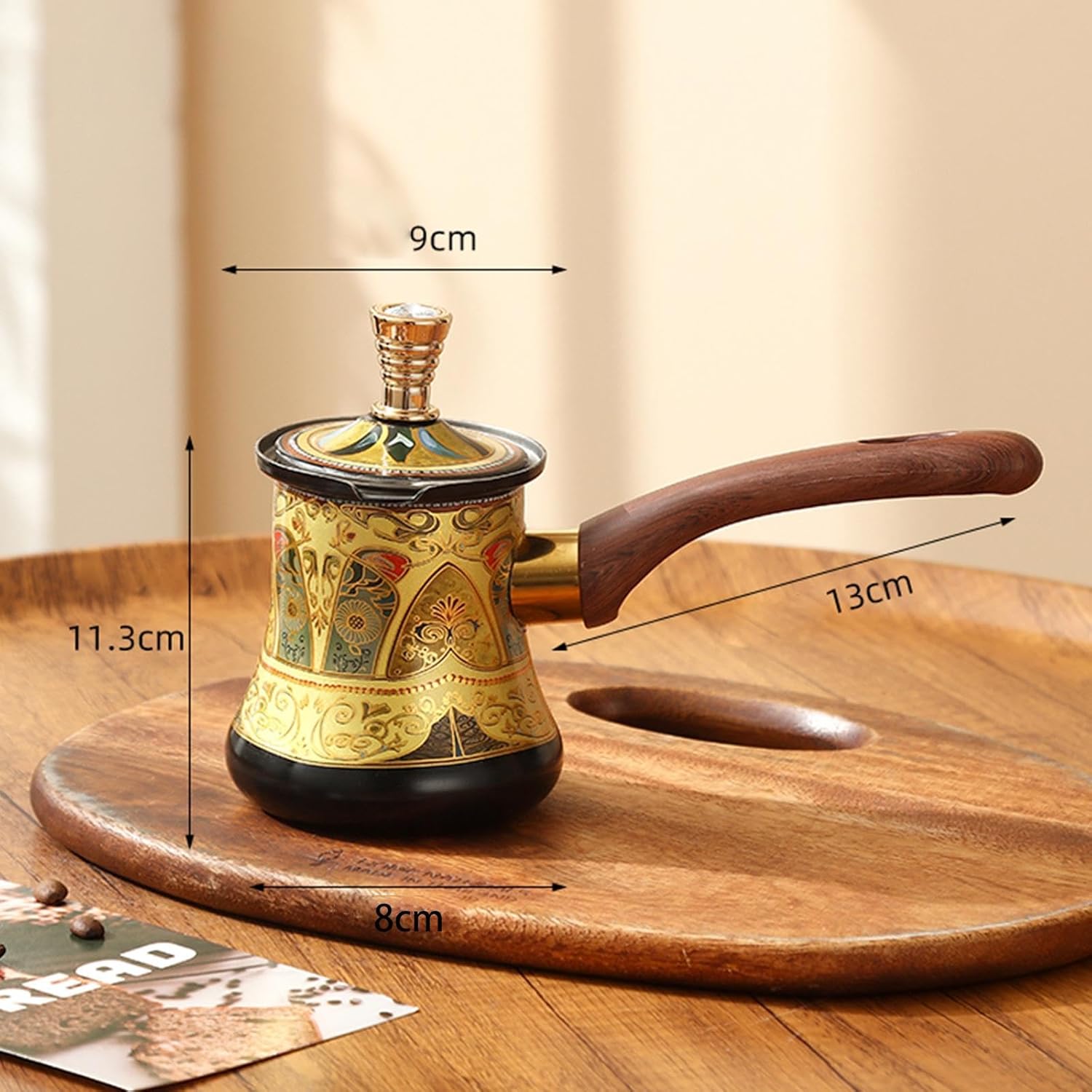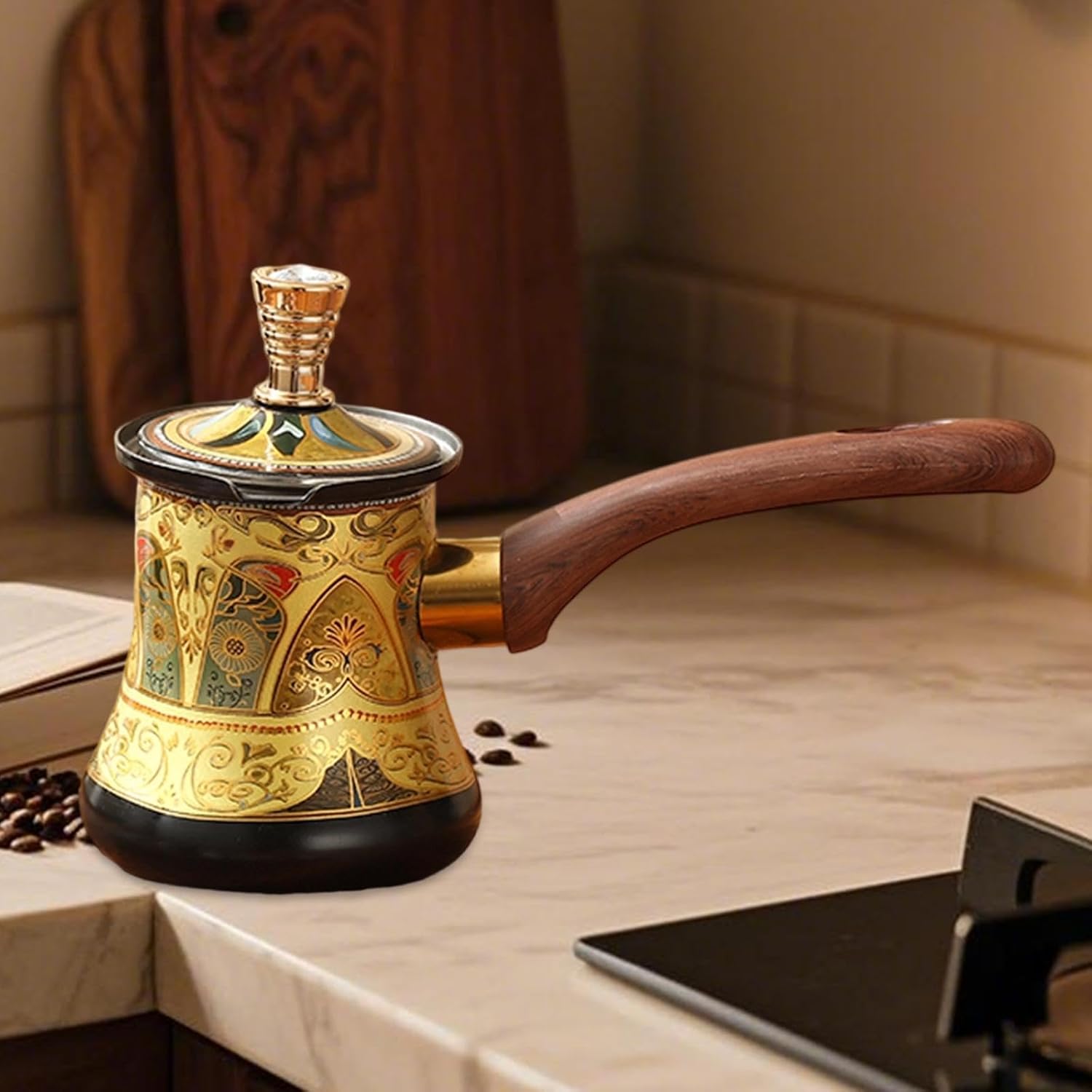 Esta cafeteira turca é fabricada em aço inoxidável espesso de alta qualidade, ideal para contato direto com alimentos. O material oferece uma distribuição de calor uniforme e excelente resistência a manchas e ferrugem, assegurando que o sabor dos ingredientes permaneça preservado e puro em todas as utilizações.