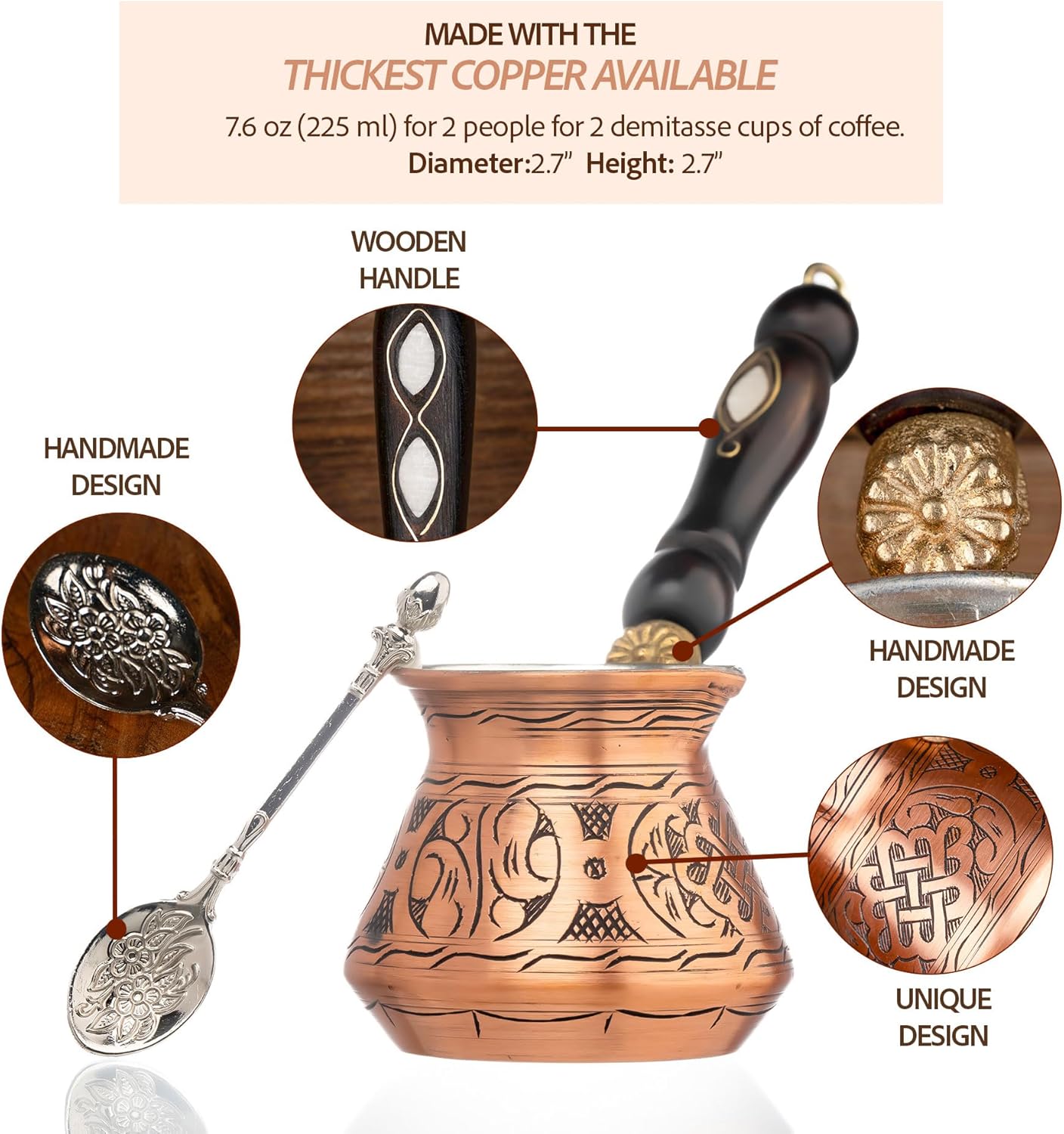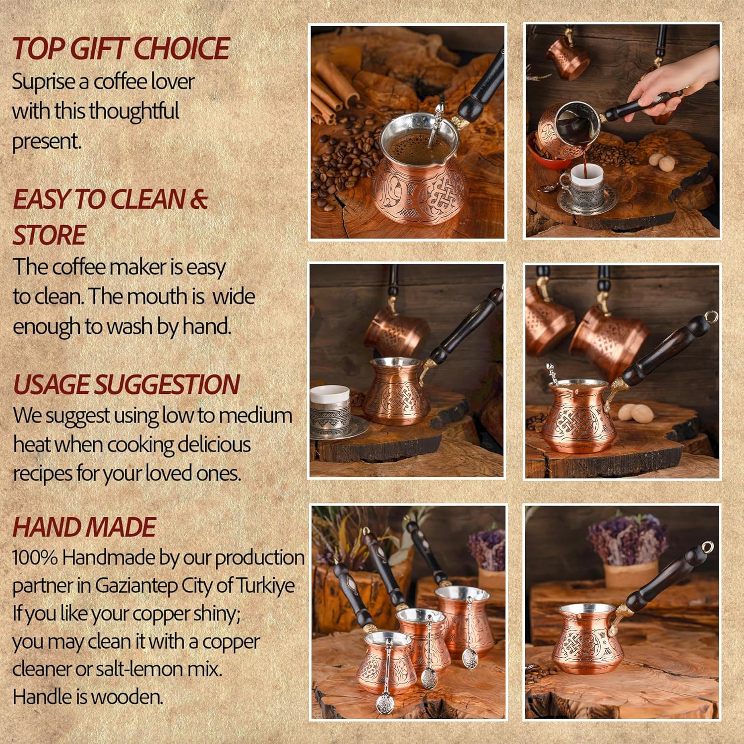 O produto acompanha uma colher exclusiva para facilitar o preparo, auxiliando na medida correta do pó de café. Com seu acabamento sofisticado na cor cobre, este cafeteiro turco não apenas prepara a bebida perfeita, mas também entrega um visual charmoso que agrega valor à decoração da sua cozinha.