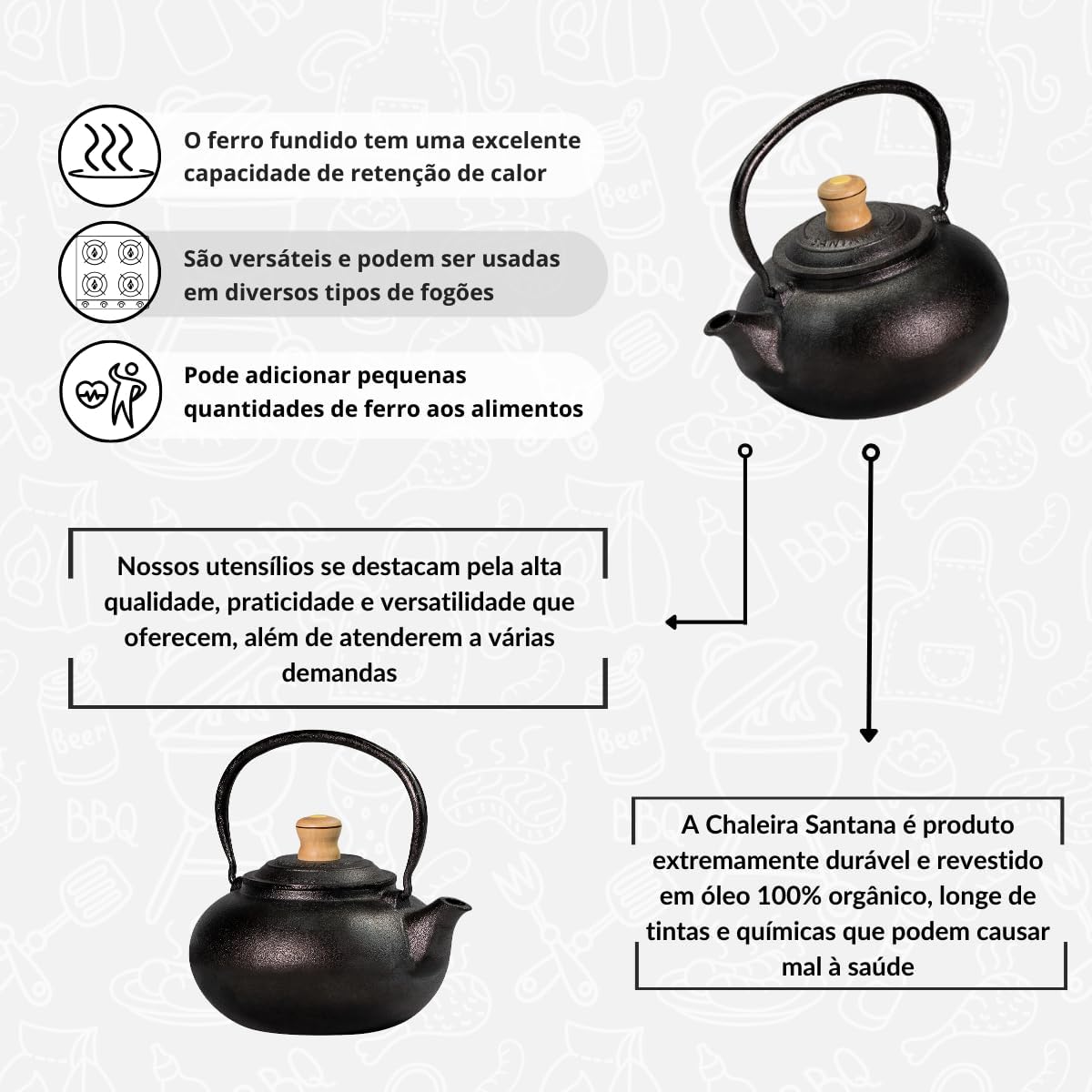 A Chaleira Santana destaca-se por sua construção em ferro fundido, que garante alta durabilidade e resistência ao uso frequente. Suportar até 2 litros possibilita preparar grandes quantidades de bebida, facilitando o dia a dia. Além disso, sua alça ergonômica proporciona conforto ao manusear, tornando o transporte seguro e prático, mesmo quando está quente.