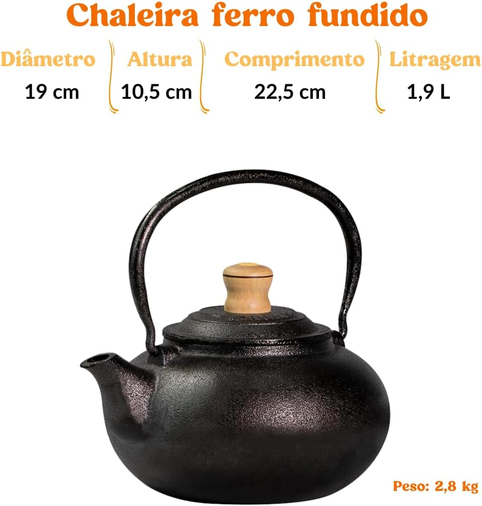 Com dimensões de 22,5 x 19 x 10,5 cm e peso de 2,8 quilogramas, a chaleira Santana é robusta, porém fácil de manusear. Fabricada em ferro fundido, o produto combina resistência e excelente retenção de calor. O modelo 3487 não utiliza baterias e é movido a gás, com registro no Inmetro 000 414/2019 garantindo qualidade e segurança no uso.