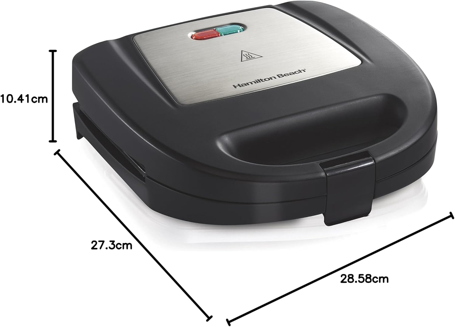 O modelo 25430 da Hamilton Beach mede 27,31 x 28,58 x 10,41 cm e pesa apenas 1,56 quilogramas, tornando-o leve e fácil de manusear. Fabricada em plástico resistente na cor preta, esta sanduicheira elétrica conta com potência de 820 watts para um aquecimento rápido e eficiente. Não utiliza baterias, funcionando exclusivamente por conexão elétrica.