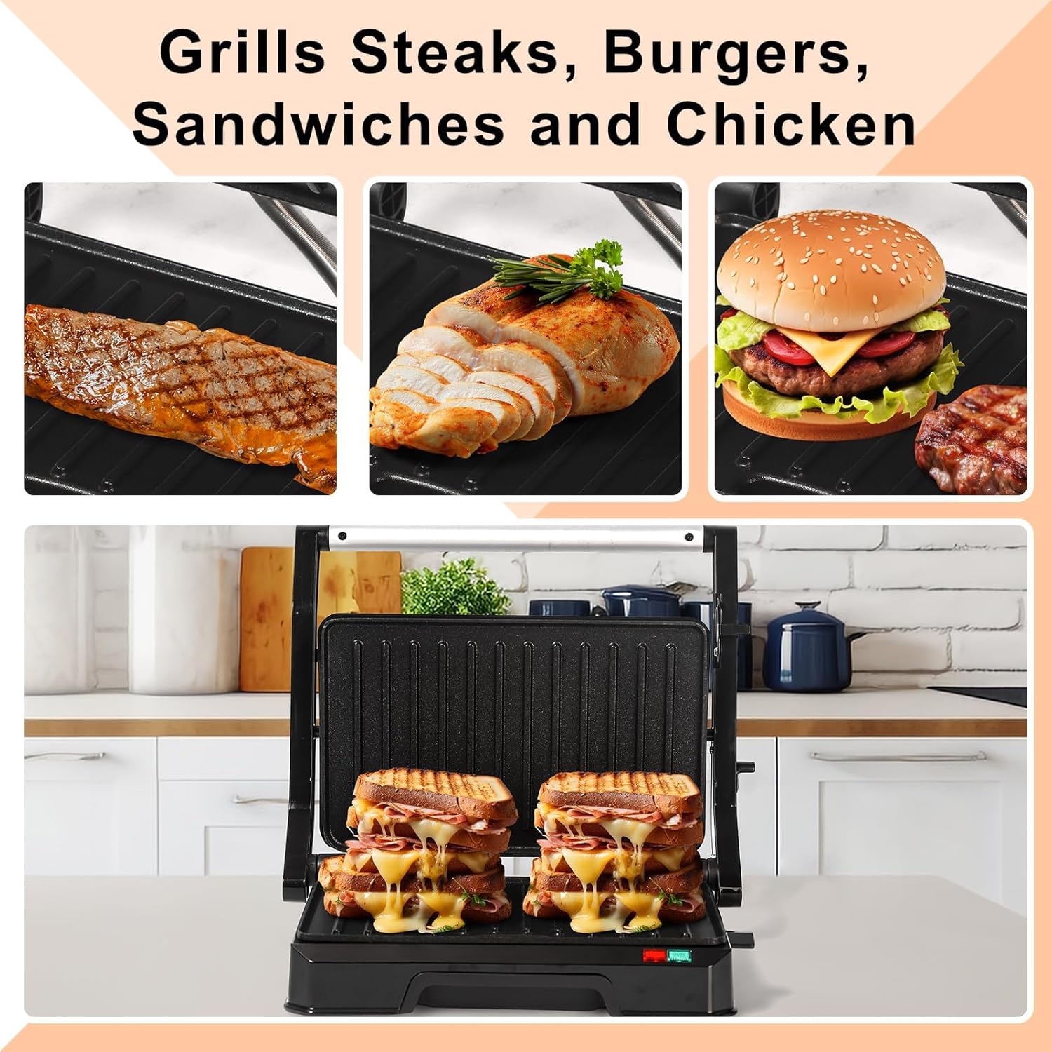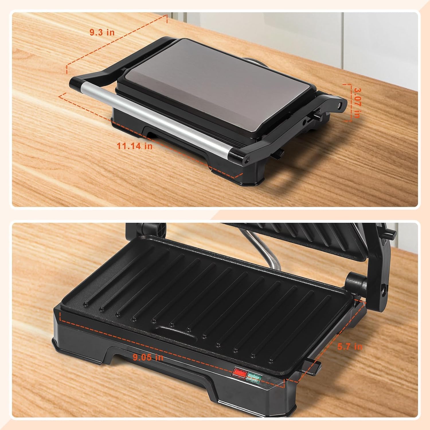 O grill tem dimensões de 22,35 x 27,43 x 6,35 cm, pesando 1,24 kg, o que facilita seu armazenamento e transporte. Fabricado com materiais resistentes como metal e plástico, o aparelho é seguro e durável. Seu modelo JK-306M não utiliza baterias e opera exclusivamente com energia elétrica de 850 watts.