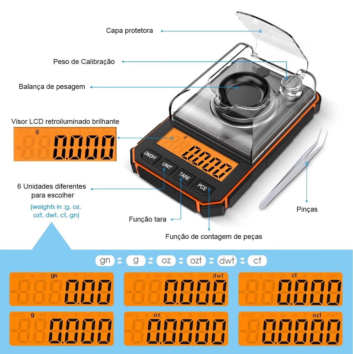Com dimensões de 14,71 x 9,91 x 3,71 cm e peso de 150,25 g, a balança é compacta e fácil de transportar. Possui capacidade máxima de 50 gramas e peso mínimo inicial de 0,006 gramas, com passo de 0,001g para máxima exatidão. Suporta medições em até seis unidades: gramas (g), onças (oz), onças troy (ozt), pennyweights (dwt), quilates (ct) e grãos (gn).