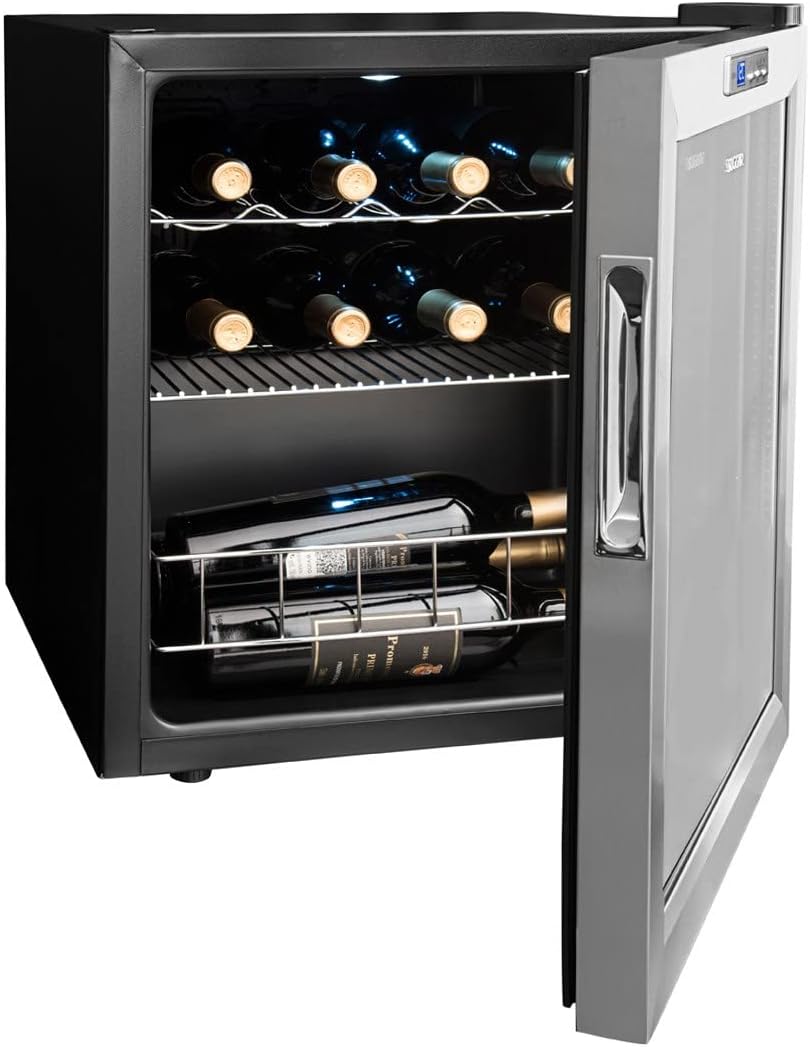 A adega modelo AD1511IX possui dimensões de 47 x 43,5 x 52 cm e peso de 20 kg, sendo um equipamento compacto de instalação independente. Construída com acabamento em aço inoxidável e vidro, ela foi projetada para armazenar até 13 garrafas com segurança e estilo, operando exclusivamente na voltagem de 127V.