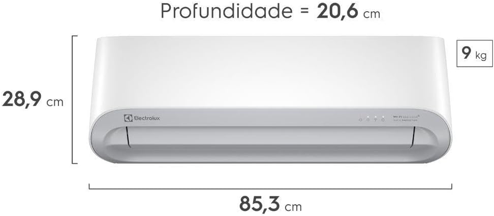 O equipamento possui capacidade de 12000 BTUs com ciclo quente/frio e utiliza gás refrigerante R32, conhecido por ser mais ecológico. A corrente elétrica é de 9,7 A e seu consumo anual de energia é de 529 kWh. As dimensões são 85,3 x 28,9 x 20,6 cm para a evaporadora e 44,6 x 55,1 x 44,6 cm para a condensadora, que pesa 33,9 kg no total.