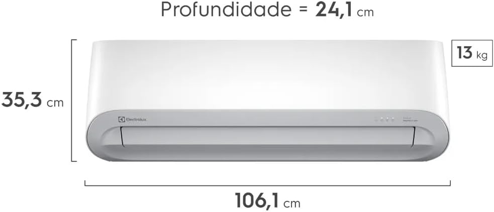 O ar-condicionado Electrolux possui dimensões de 100 x 36 x 100 cm e pesa 43,6 quilogramas. O modelo split minisplit é equipado com um compressor inverter que melhora a eficiência e a performance do aparelho. Este equipamento é projetado para instalação fácil e adapta-se à decoração, podendo ser pintado para combinar com o ambiente.