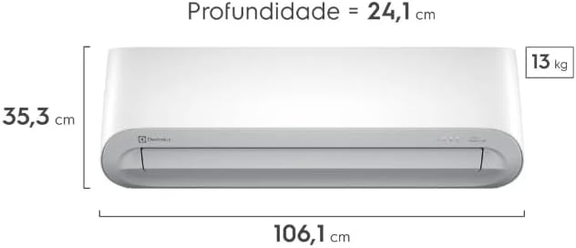 O ar-condicionado Electrolux possui capacidade de 1,5 Tons e configuração split de instalação stand-alone. Seu compressor inverter confere alta eficiência e funcionamento silencioso. As dimensões da embalagem são 106,1 x 35,3 x 24 cm, com peso total de 21 quilogramas.