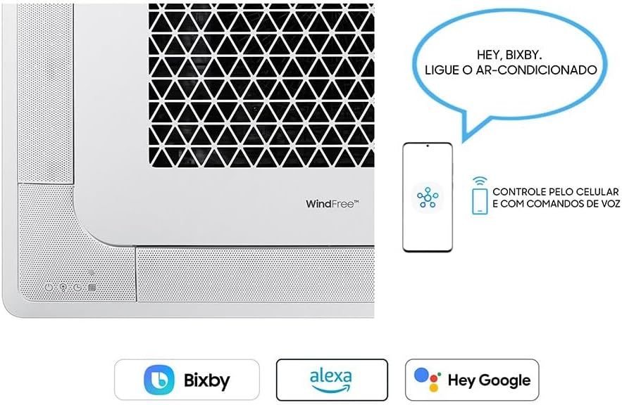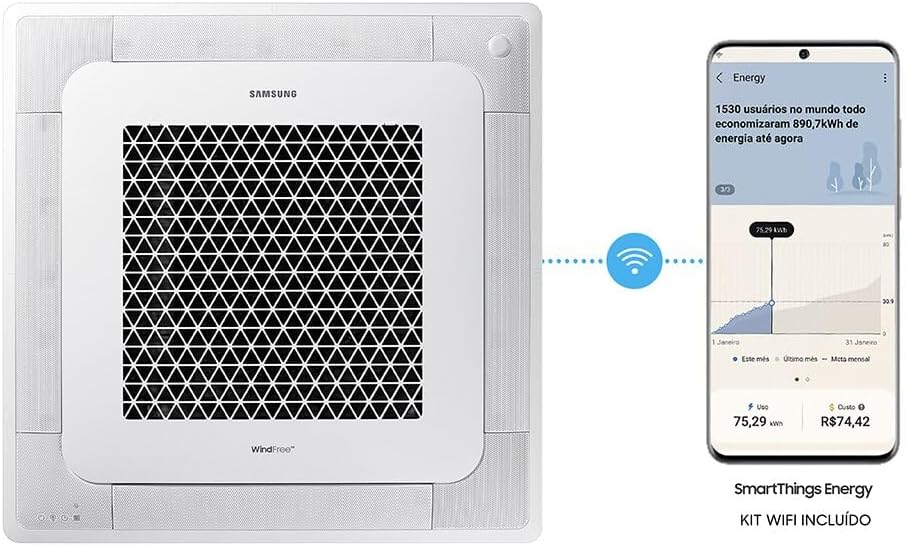 O modelo oferece conexão Wi-Fi para controle remoto, mas a instalação deve ser feita no teto, o que requer avaliação técnica prévia. A função WindFree proporciona resfriamento sem vento direto, essencial para quem deseja conforto térmico sem correntes de ar incômodas.