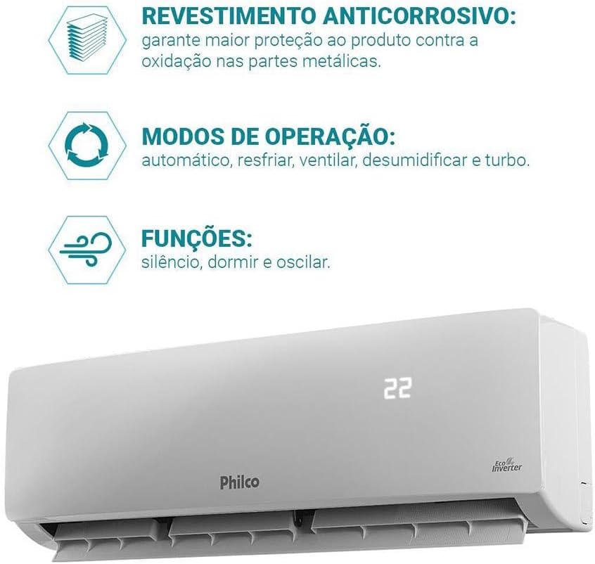 A unidade externa possui proteção GoldFin, aumentando a resistência contra corrosão, e a pintura anticorrosivo protege contra a oxidação e maresia. A conectividade Wi-Fi, por meio do Kit Philco Home Smart (vendido separadamente), permite controle remoto integrado com Google e Alexa, trazendo mais praticidade e controle inteligente ao seu dia a dia.