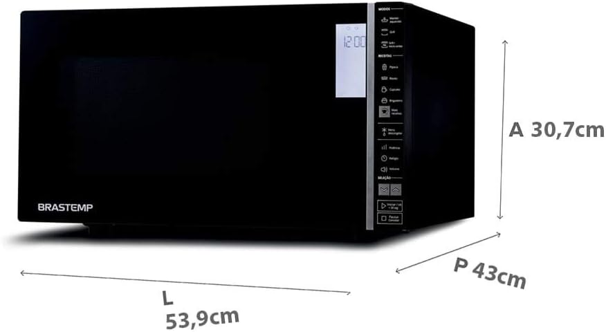 O micro-ondas Brastemp conta com capacidade de 32 litros, medidas de 47,8 x 60,8 x 36,6 cm e peso aproximado de 16 kg, proporcionando espaço adequado para diversas panelas e utensílios. Funciona na voltagem de 110 volts, com frequência de 60 Hz, utilizando energia elétrica sem necessidade de baterias.