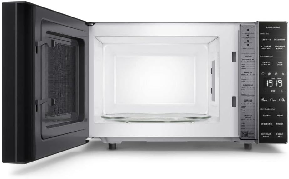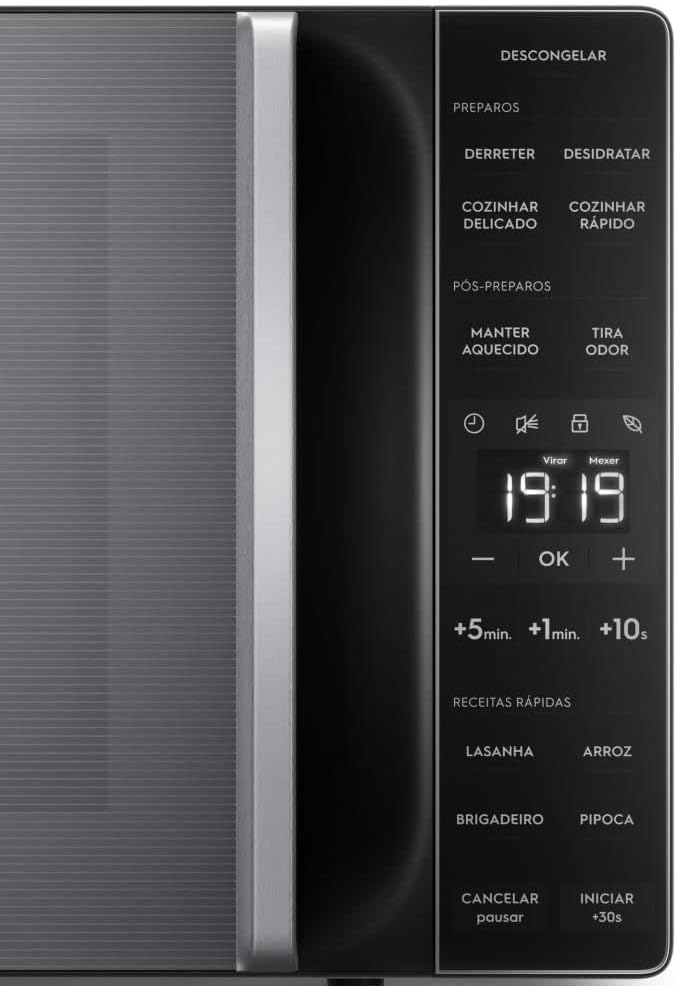 Além disso, a função descongelamento assistido avisa o momento ideal para virar ou mexer os alimentos, garantindo resultados uniformes. A função mudo permite operar o micro-ondas sem emitir sons, perfeito para ambientes silenciosos, enquanto o sistema tira odor mantém o aparelho sem cheiro, pronto para o próximo uso.
