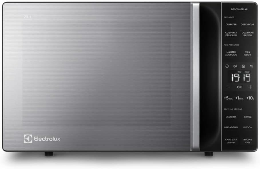 Este micro-ondas Electrolux mede 35,2 cm de altura, 46,1 cm de largura e 29 cm de profundidade, pesando 11,4 kg. Construído em aço, plástico e vidro, apresenta um acabamento prata elegante e resistente. A capacidade interna de 23 litros atende facilmente famílias pequenas e médias.