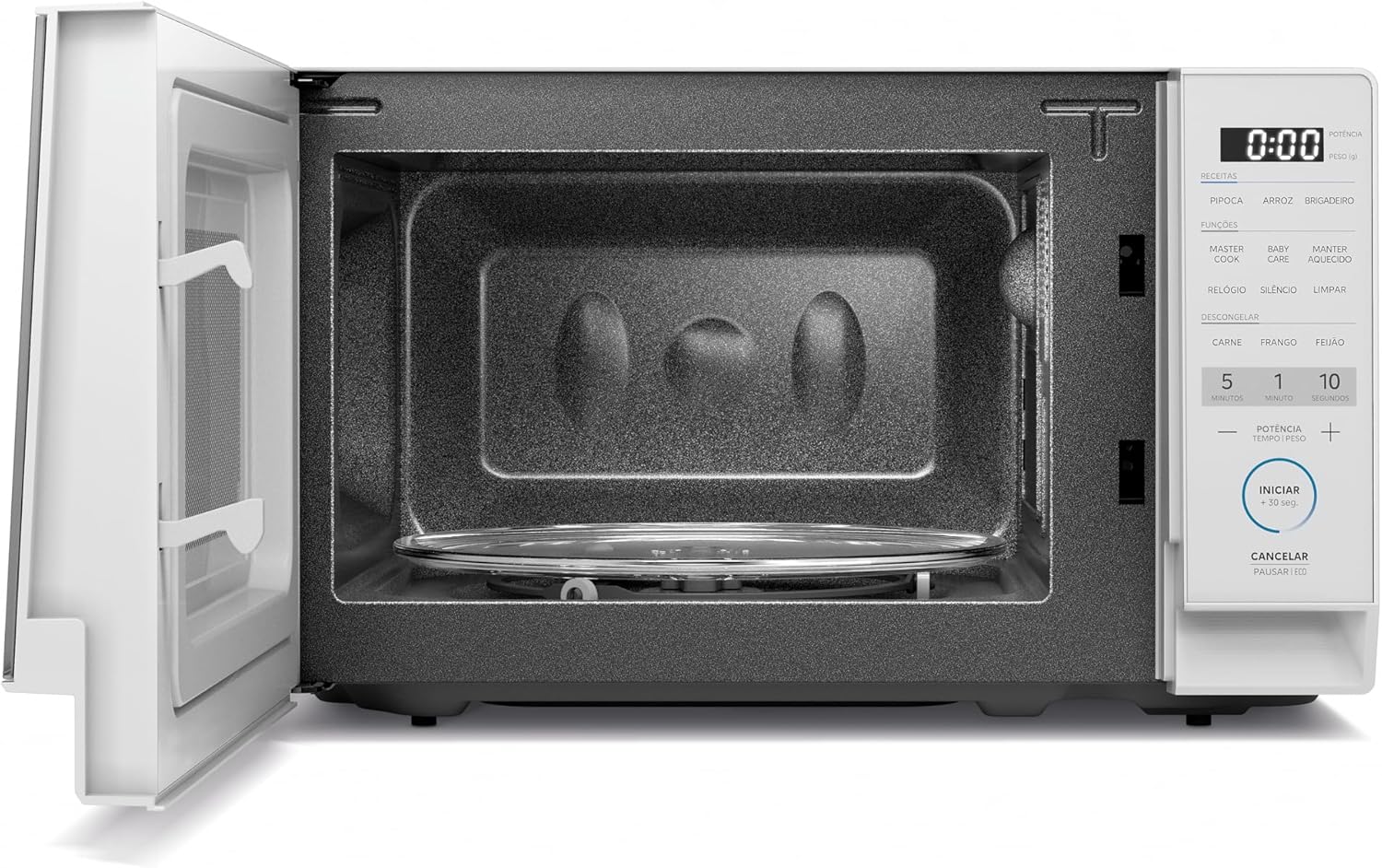 Esse micro-ondas possui a função MasterCook, que permite desidratar alimentos, derreter ingredientes, cozinhar no vapor, assar e até fermentar massas e iogurtes, ampliando suas possibilidades culinárias. Com a tecla Ligar/+30 segundos, você realiza ajustes rápidos, aumentando a praticidade no uso.