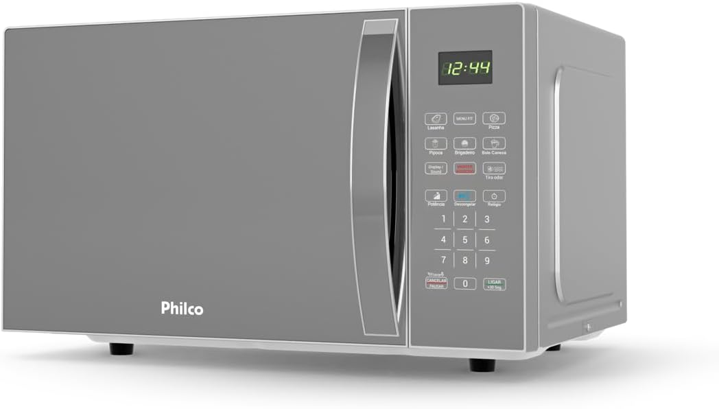 O modelo PMO38S da Philco tem dimensões de 38,7 x 51,5 x 30,4 cm e pesa 13,15 quilogramas, ideal para instalação sobre bancada. Fabricado em aço inoxidável com acabamento espelhado/prata, oferece durabilidade e facilidade de limpeza. Conta com capacidade de 33 litros e potência de 1400 watts, operando em 220 volts.
