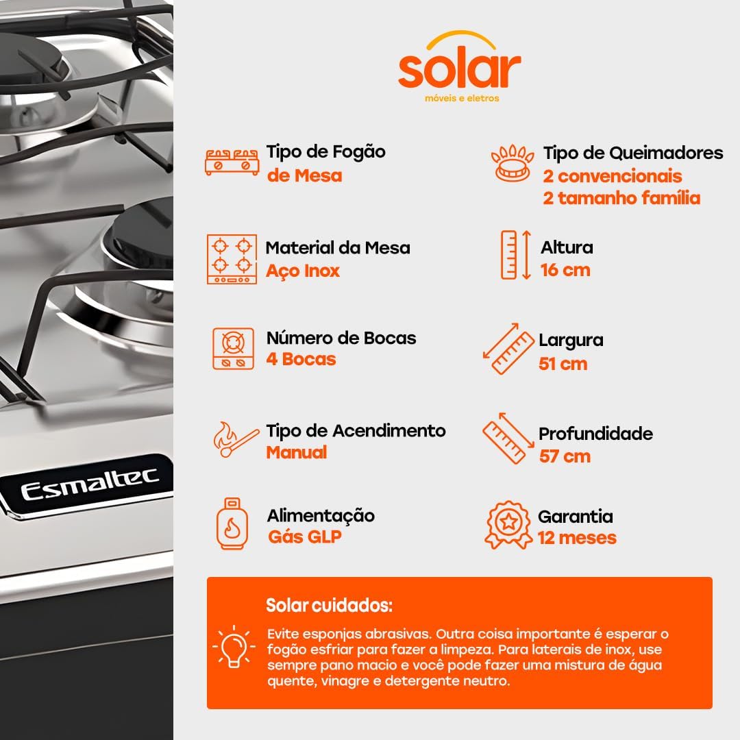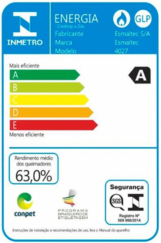 No que se refere à embalagem, o produto possui 17,5 cm de altura, 52,5 cm de largura e 58,5 cm de profundidade, com um peso bruto de 4,7 kg. O conjunto inclui o fogão pronto para uso, mantendo o padrão de certificação 2100100 da fabricante Esmaltec.