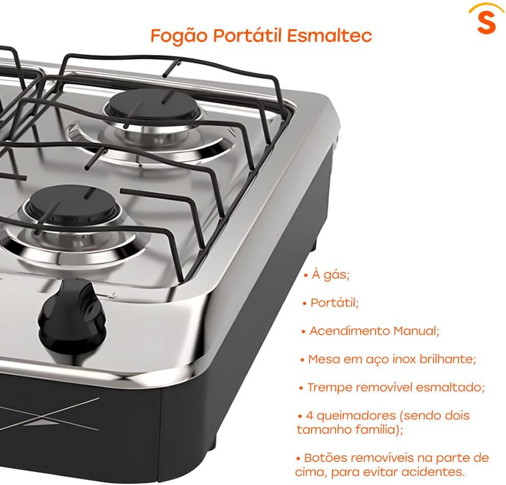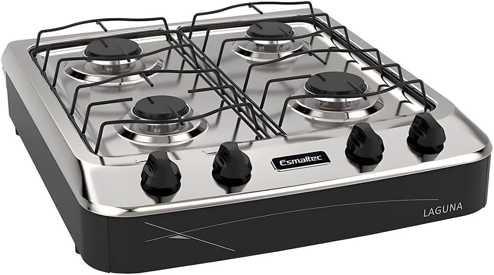 Este equipamento utiliza gás GLP, oferecendo um controle manual preciso para cada queimador. Graças à sua construção em alumínio e acabamento resistente na cor preta, este fogão 4 bocas Esmaltec combina robustez com um manuseio intuitivo e seguro para o dia a dia.
