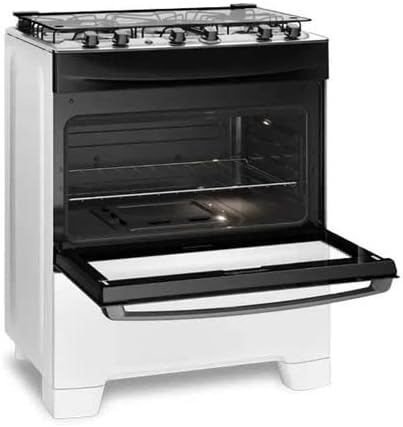 Este eletrodoméstico possui dimensões de 60,5 x 76 x 97 cm e pesa 33,8 kg, oferecendo uma estrutura robusta e estável. O fogão opera com voltagem de 110V e é alimentado por gás natural, garantindo um desempenho confiável com classificação de eficiência energética A.