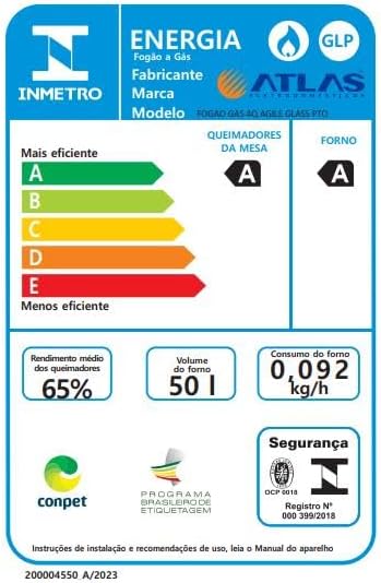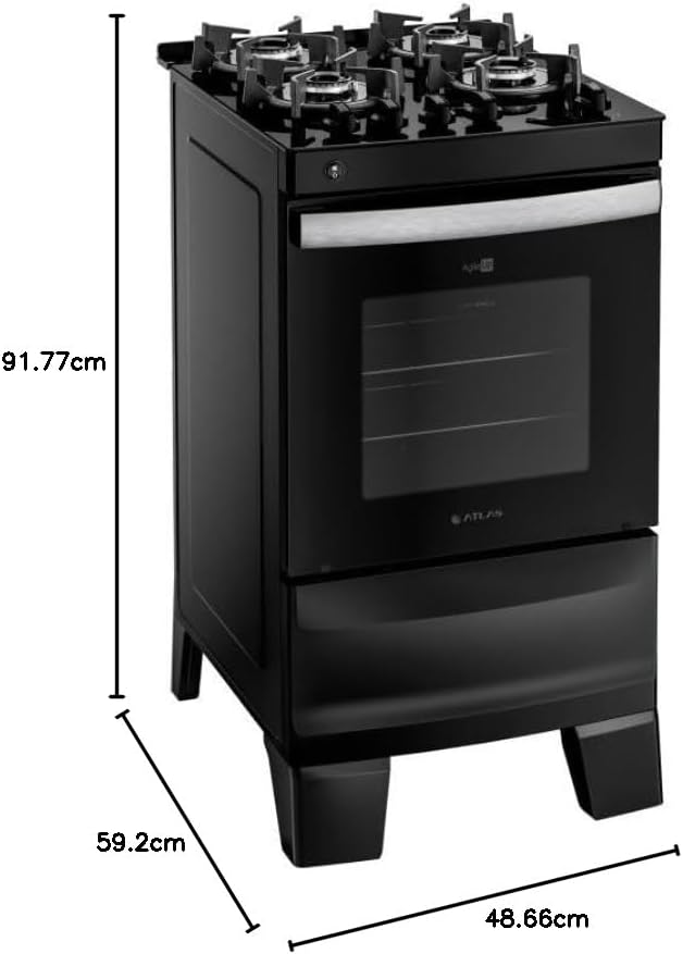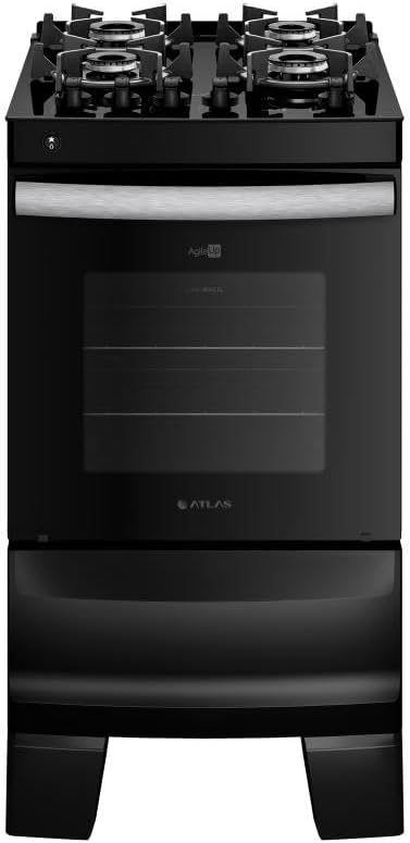 Projetado com foco na eficiência energética A, este fogão Atlas possui dimensões totais de 60,26 x 49,56 x 93,52 cm e pesa 22,6 kg. Construído com materiais robustos como aço, ferro fundido e vidro, ele suporta o uso intenso sem comprometer a estrutura.