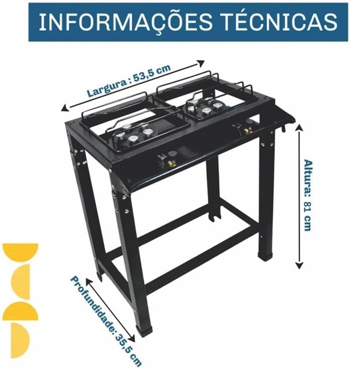 O fogão possui dimensões totais de 81 cm de altura, 53,5 cm de largura e 35,5 cm de profundidade, com um quadro de mesa de 530×280 mm. Com peso de apenas 5,8 kg, é leve para movimentação, suportando até 8 kg por boca, ideal para panelas com diâmetro recomendado de 22 cm.