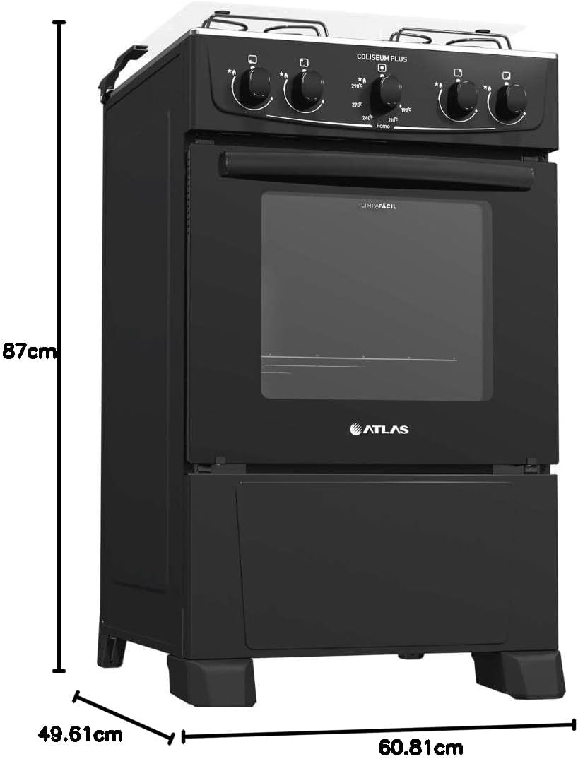 O modelo 300000720 possui dimensões de 60,8 x 49,6 x 87 cm e pesa 17,1 kg, sendo ideal para instalações independentes. Com capacidade de 50 litros no forno e classificação de eficiência energética A, este fogão Atlas otimiza o consumo de gás GLP em seu lar.