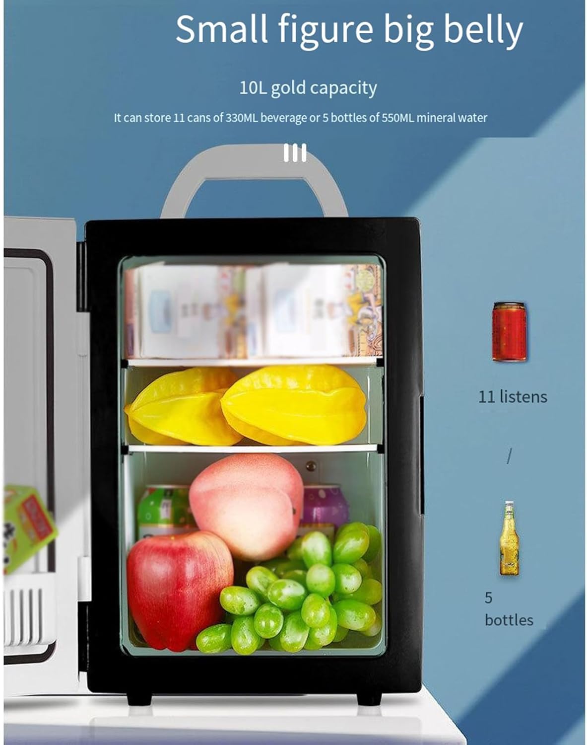 Com uma capacidade interna de 10 litros, você pode organizar facilmente até 11 latas de 330 ml ou 5 garrafas de 550 ml. Além disso, o design com alça portátil facilita o transporte, permitindo que você leve seu sistema de refrigeração para o escritório, quarto ou viagens com total liberdade.