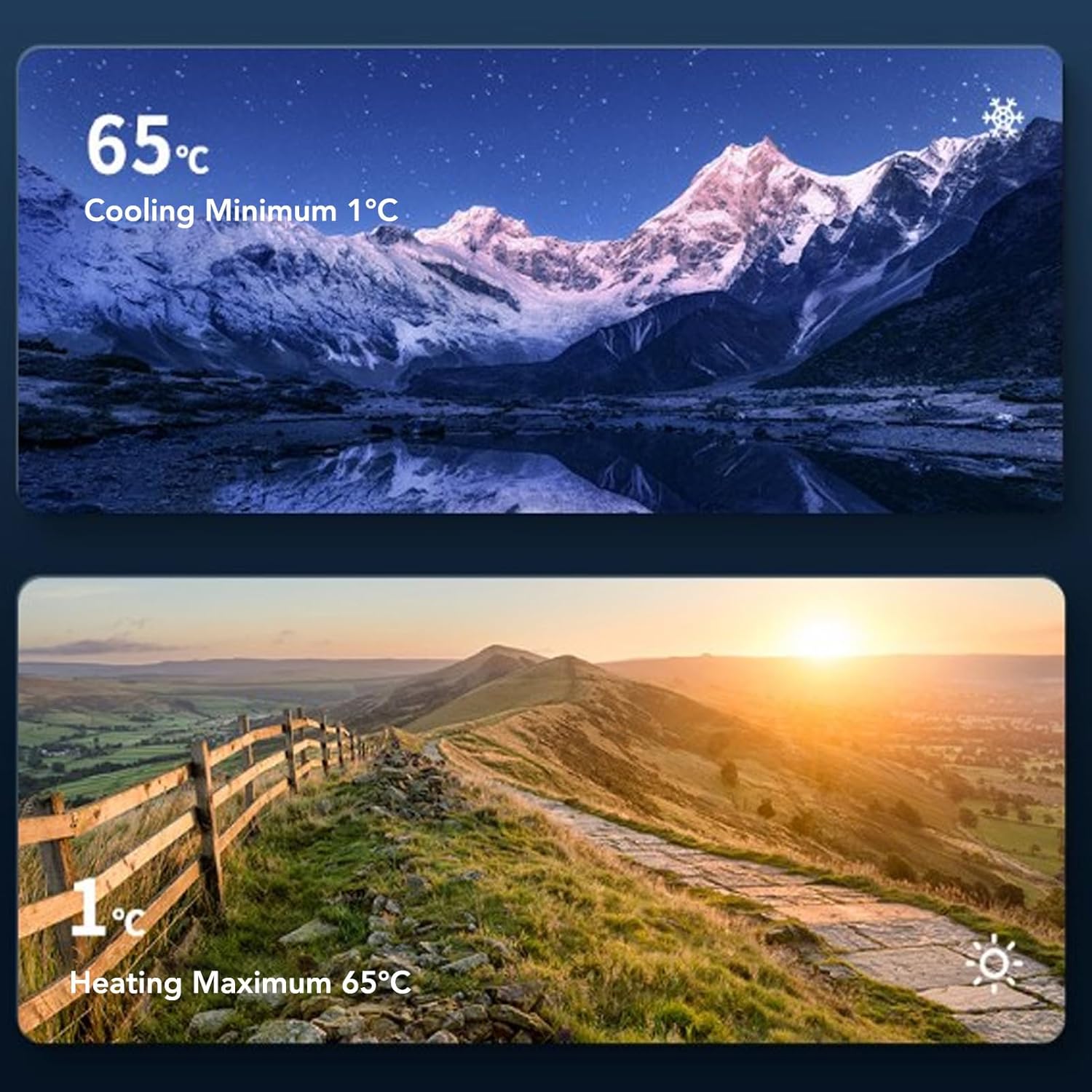 O controle térmico é preciso, atingindo o resfriamento mínimo de 1°C e o aquecimento máximo de 65°C. O aparelho é alimentado por uma interface USB, facilitando a conexão em computadores, carregadores veiculares ou adaptadores compatíveis.