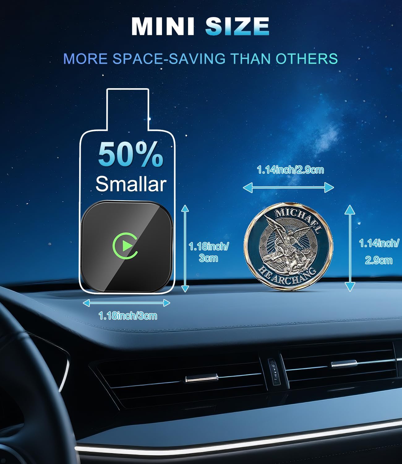 O dispositivo possui dimensões ultracompactas de 3 x 3 x 2,41 cm e pesa apenas 38 gramas, tornando-se uma peça discreta em qualquer porta USB tipo C. O modelo é compatível com iPhones rodando sistema iOS 10 ou superior, garantindo ampla versatilidade para usuários da marca Apple enquanto dirige.