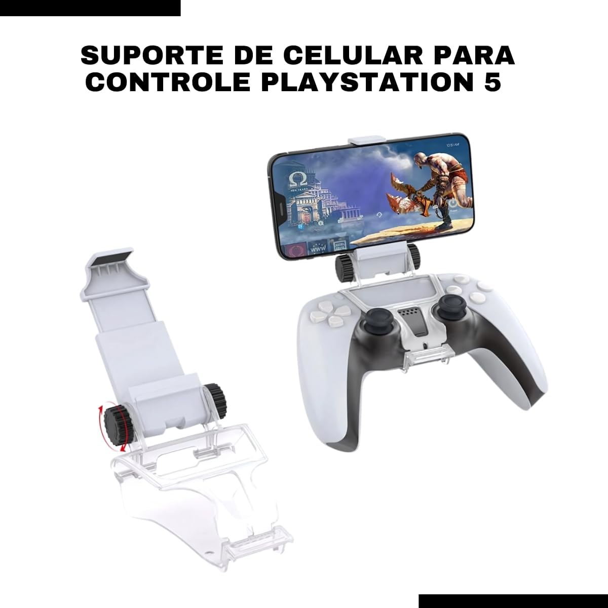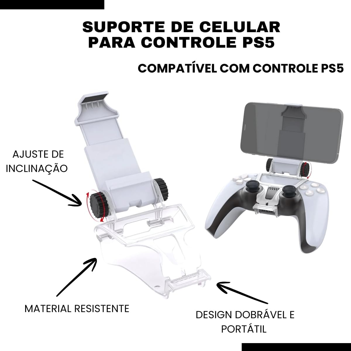 O suporte para controle PS5 DualSense permite ajuste do ângulo do smartphone, garantindo melhor visualização e uma posição ergonômica durante jogos como Call of Duty Mobile, Fortnite e PUBG. Seu design leve e dobrável facilita o transporte, tornando-o perfeito para levar em viagens ou usar em sessões longas de jogos mobile.