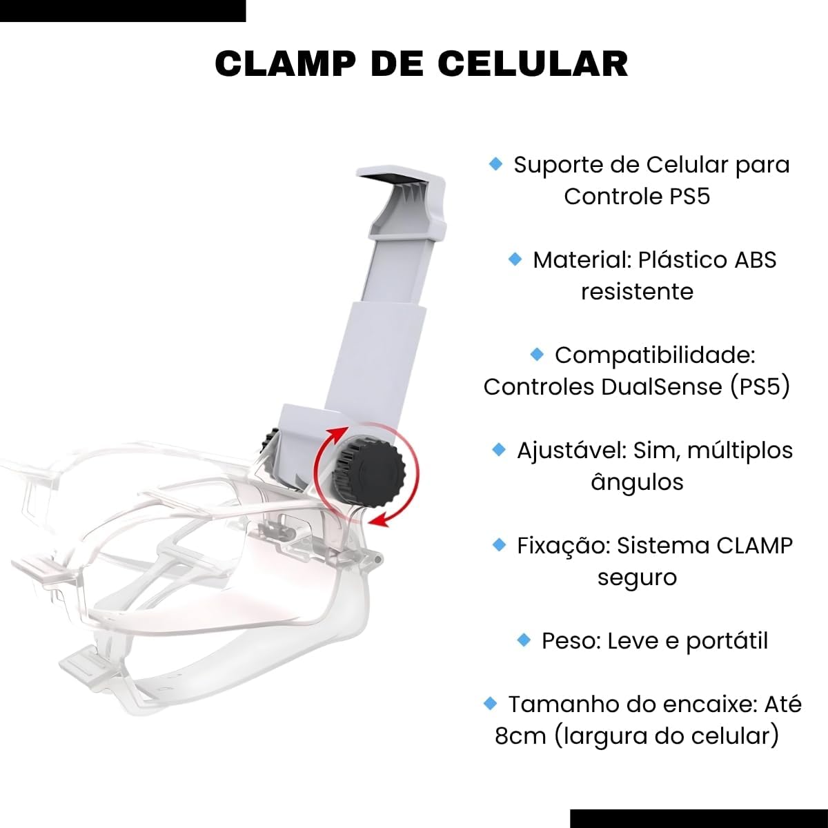 Este suporte de celular para controle PS5 DualSense mede 9 x 6 x 6 cm e pesa apenas 20 gramas, garantindo leveza e portabilidade. Seu design foi pensado para encaixe perfeito no controle original PlayStation 5, oferecendo firmeza sem danificar o aparelho. Não possui certificação específica e possui ASIN B0CDNKZCZ2.